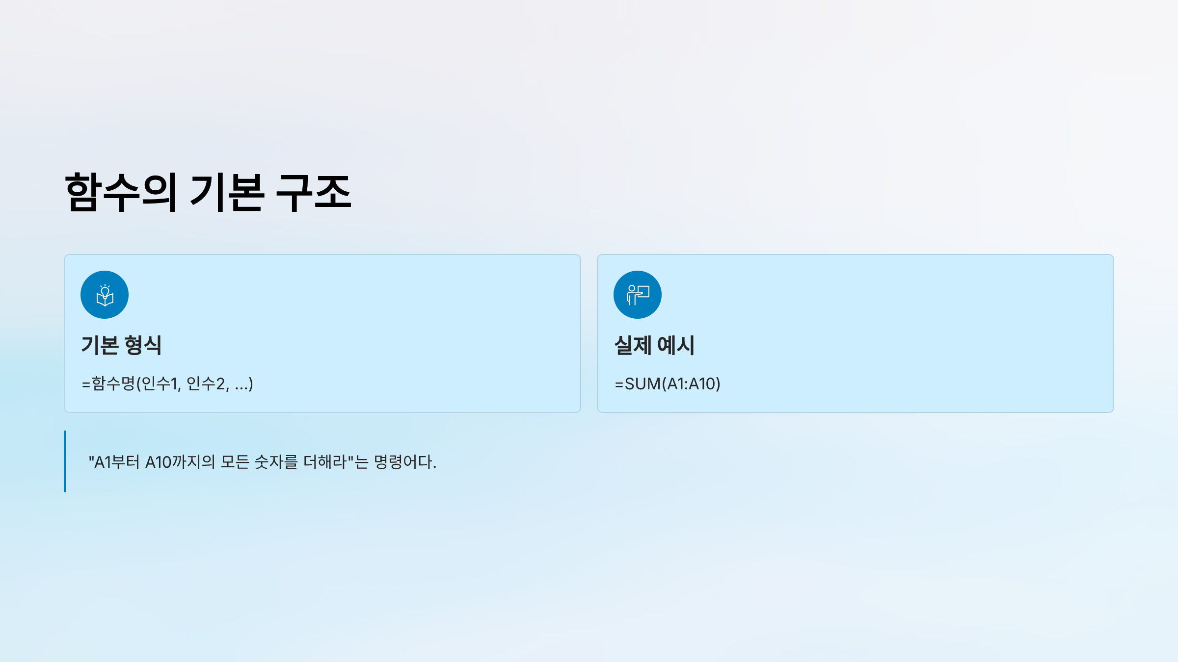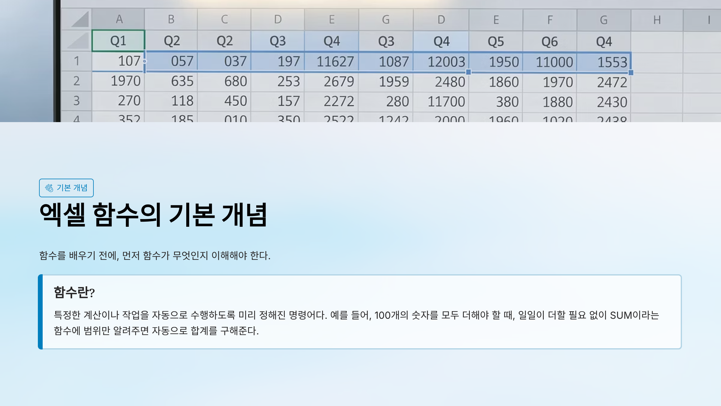 함수는 특정한 계산이나 작업을 자동으로 수행하도록 미리 정해진 명령어다. 예를 들어, 100개의 숫자를 모두 더해야 할 때, 일일이 더할 필요 없이 SUM이라는 함수에 범위만 알려주면 자동으로 합계를 구해준다.