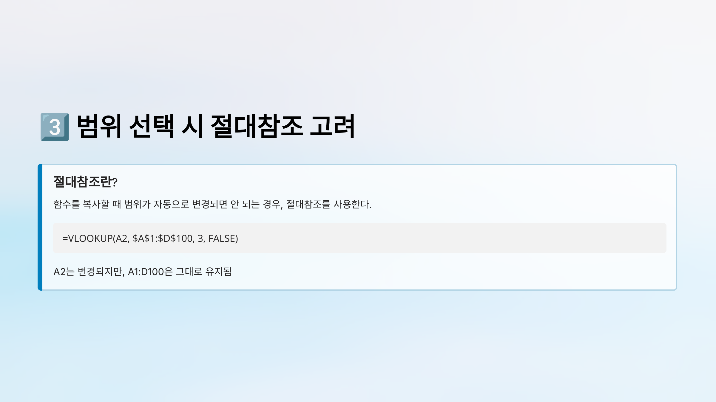 함수를 복사할 때 범위가 자동으로 변경되면 안 되는 경우, 절대참조를 사용한다.