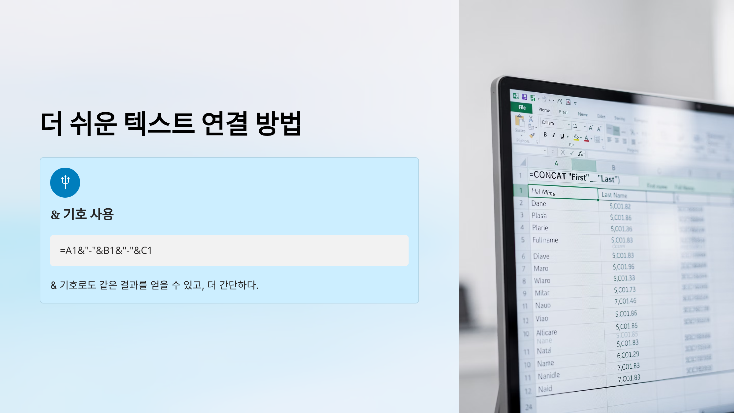 여러 셀의 내용을 하나로 합칠 때 사용한다. 이름 + 번호로 고유 ID 만들기, 주소 조합 등에 유용하다.