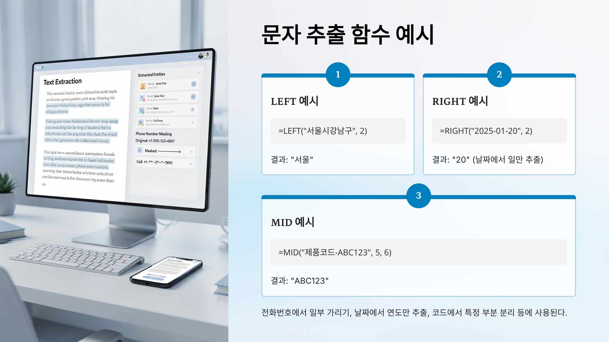 전화번호에서 일부 가리기, 날짜에서 연도만 추출, 코드에서 특정 부분 분리 등에 사용된다.