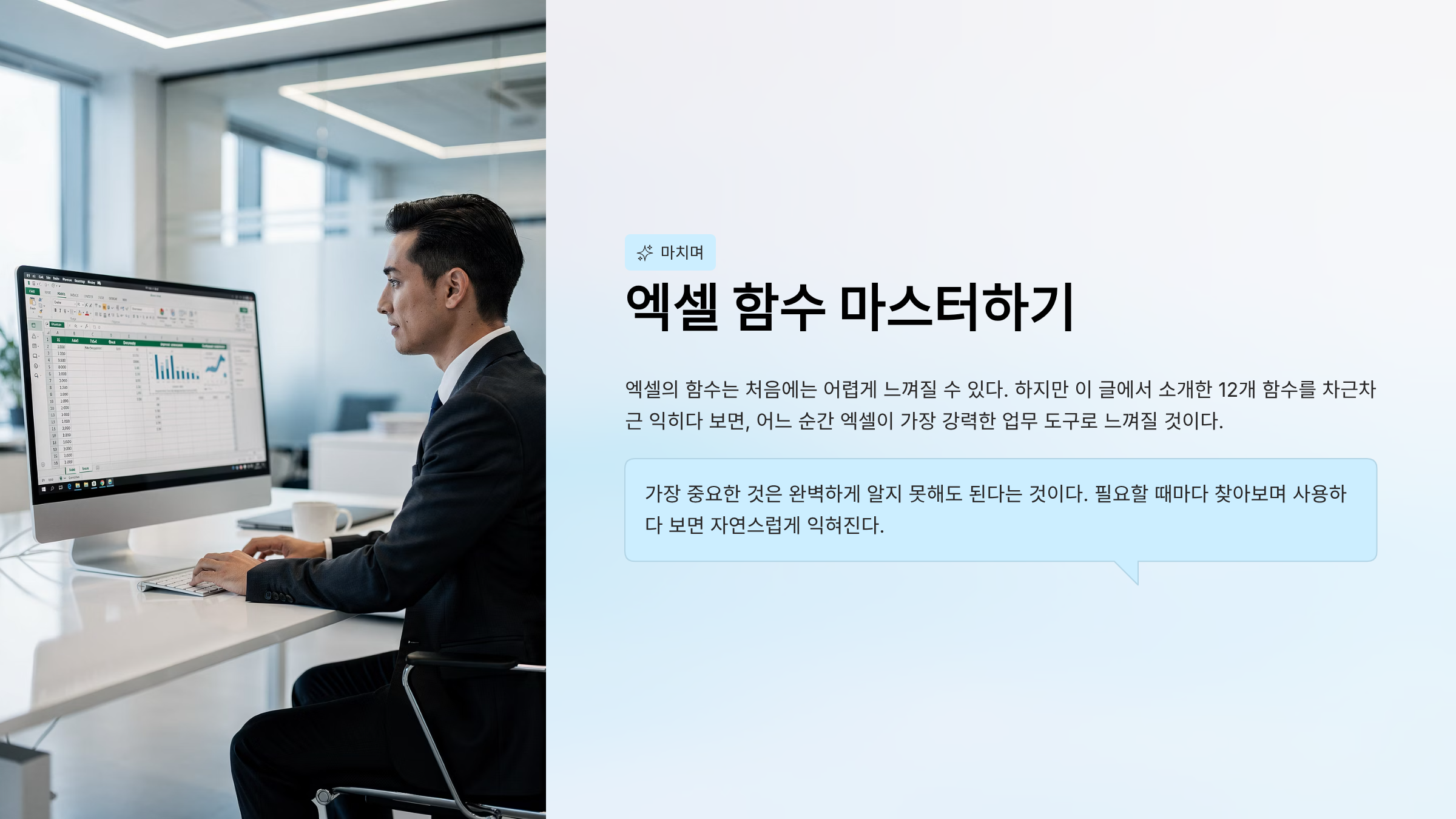 엑셀의 함수는 처음에는 어렵게 느껴질 수 있다. 하지만 이 글에서 소개한 12개 함수를 차근차근 익히다 보면, 어느 순간 엑셀이 가장 강력한 업무 도구로 느껴질 것이다.