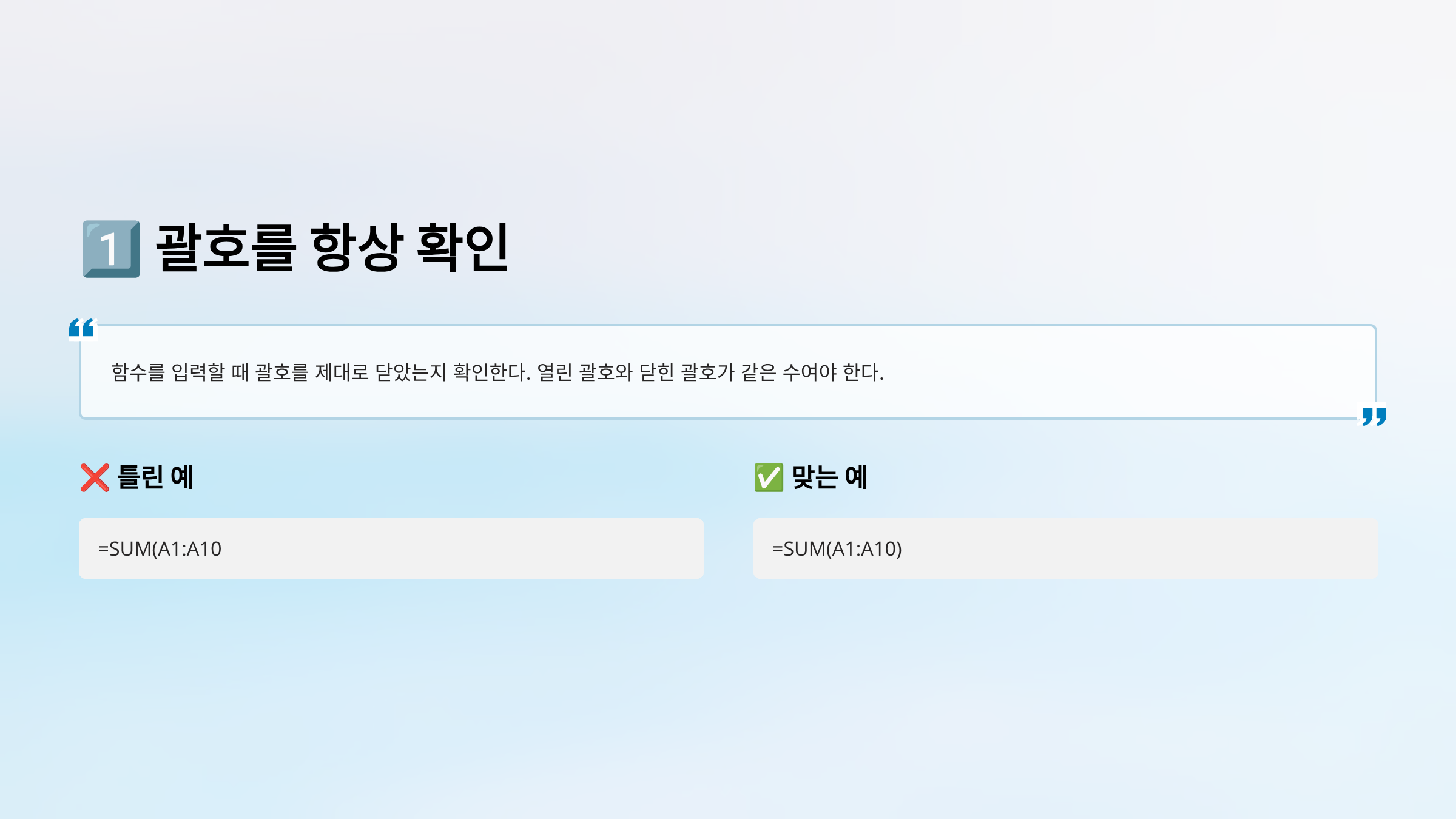 함수를 입력할 때 괄호를 제대로 닫았는지 확인한다. 열린 괄호와 닫힌 괄호가 같은 수여야 한다.