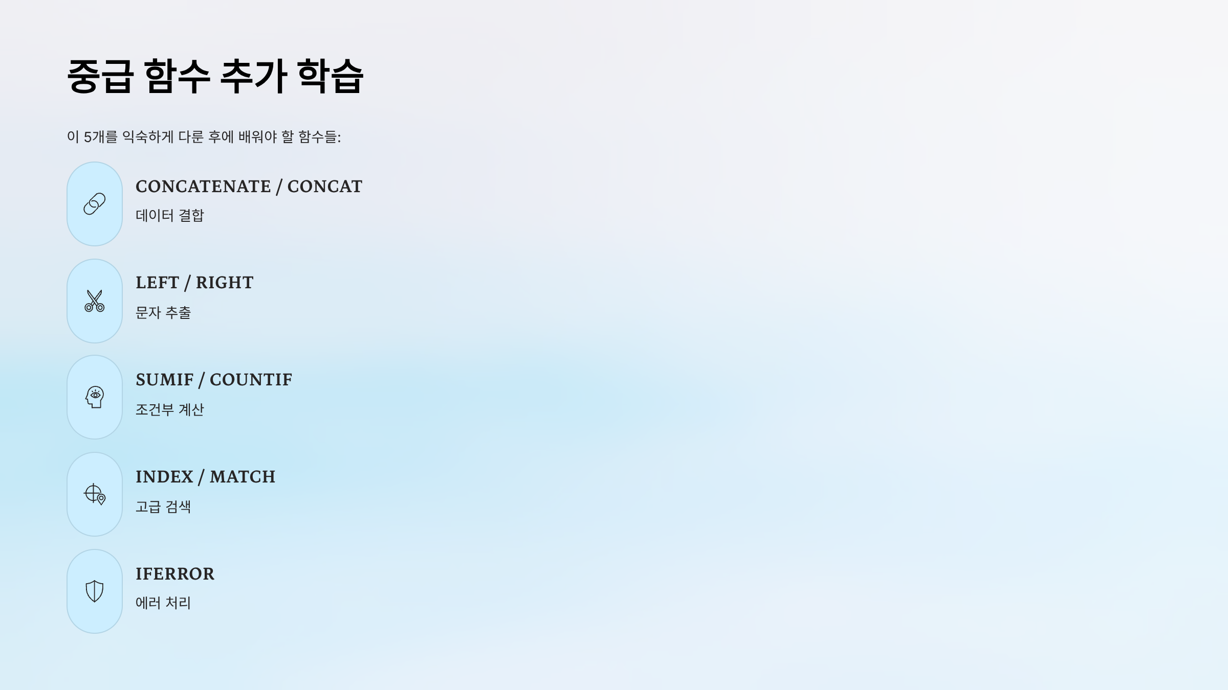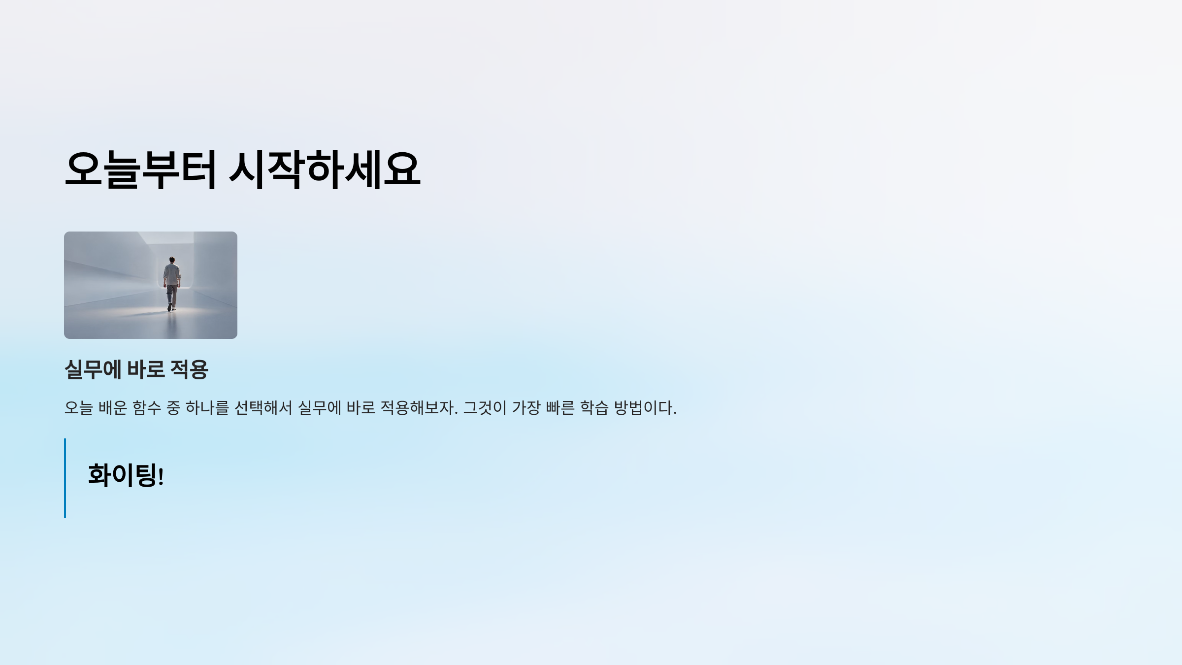 가장 중요한 것은 완벽하게 알지 못해도 된다는 것이다. 필요할 때마다 찾아보며 사용하다 보면 자연스럽게 익혀진다. 오늘 배운 함수 중 하나를 선택해서 실무에 바로 적용해보자. 그것이 가장 빠른 학습 방법이다. 화이팅!