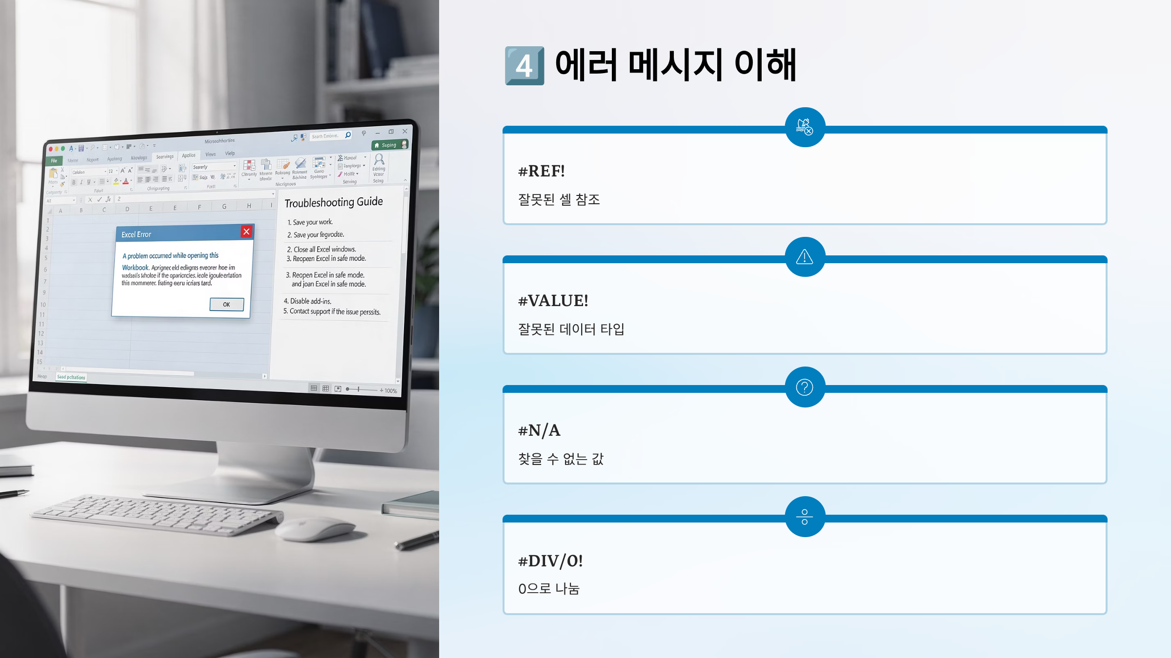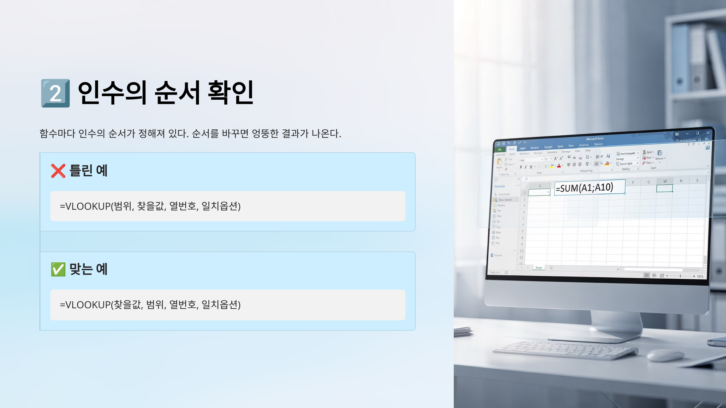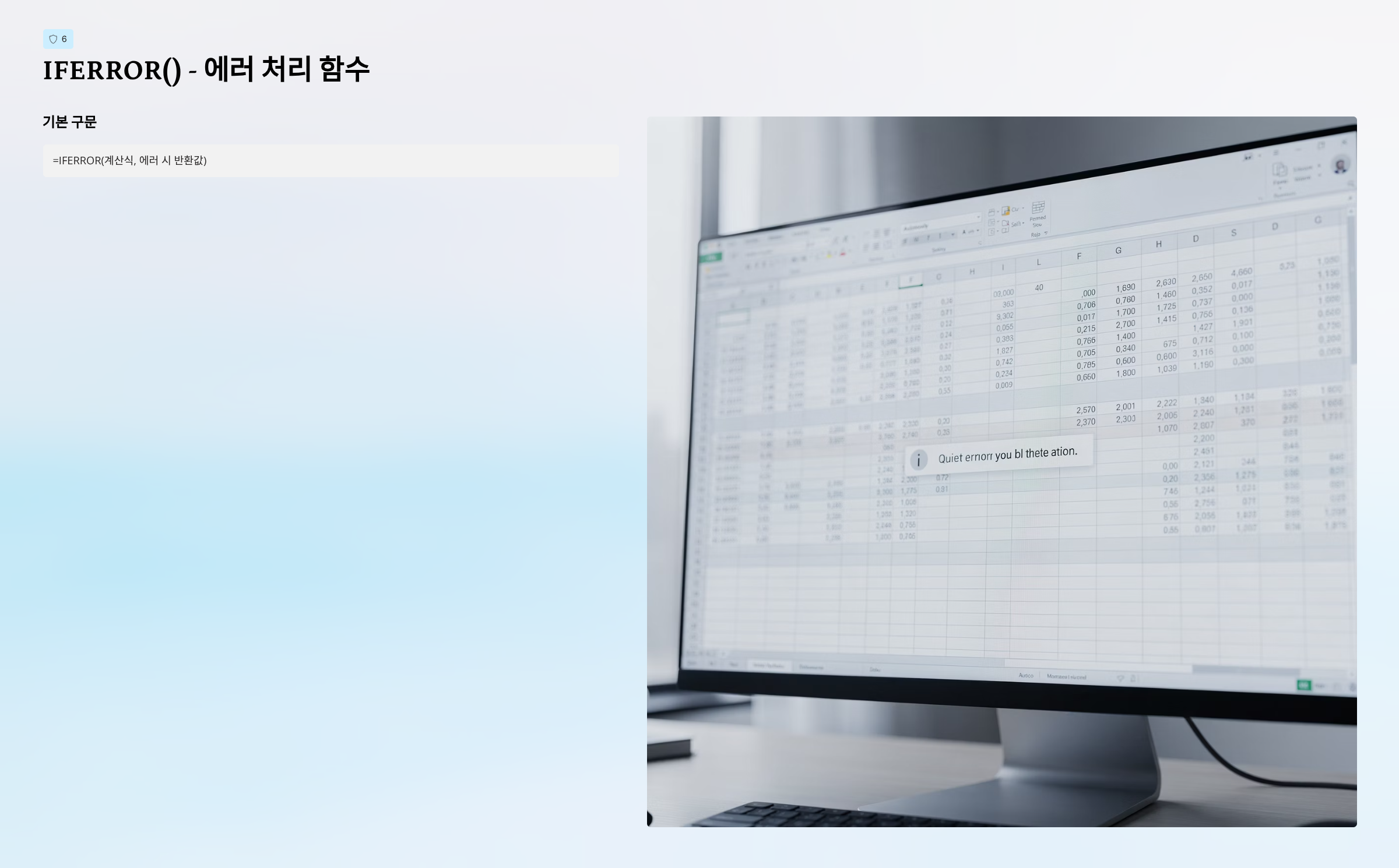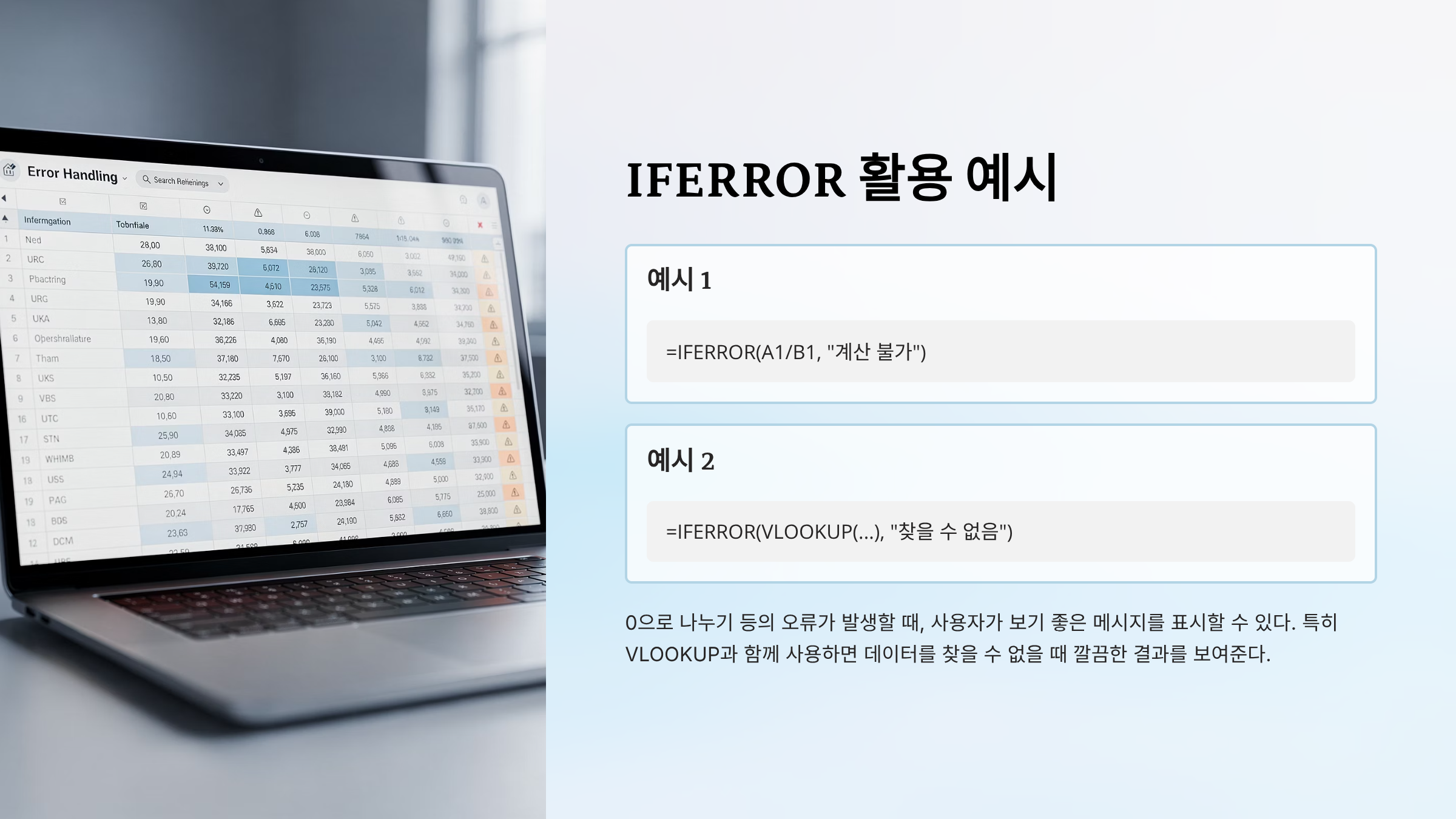 0으로 나누기 등의 오류가 발생할 때, 사용자가 보기 좋은 메시지를 표시할 수 있다. 특히 VLOOKUP과 함께 사용하면 데이터를 찾을 수 없을 때 깔끔한 결과를 보여준다.