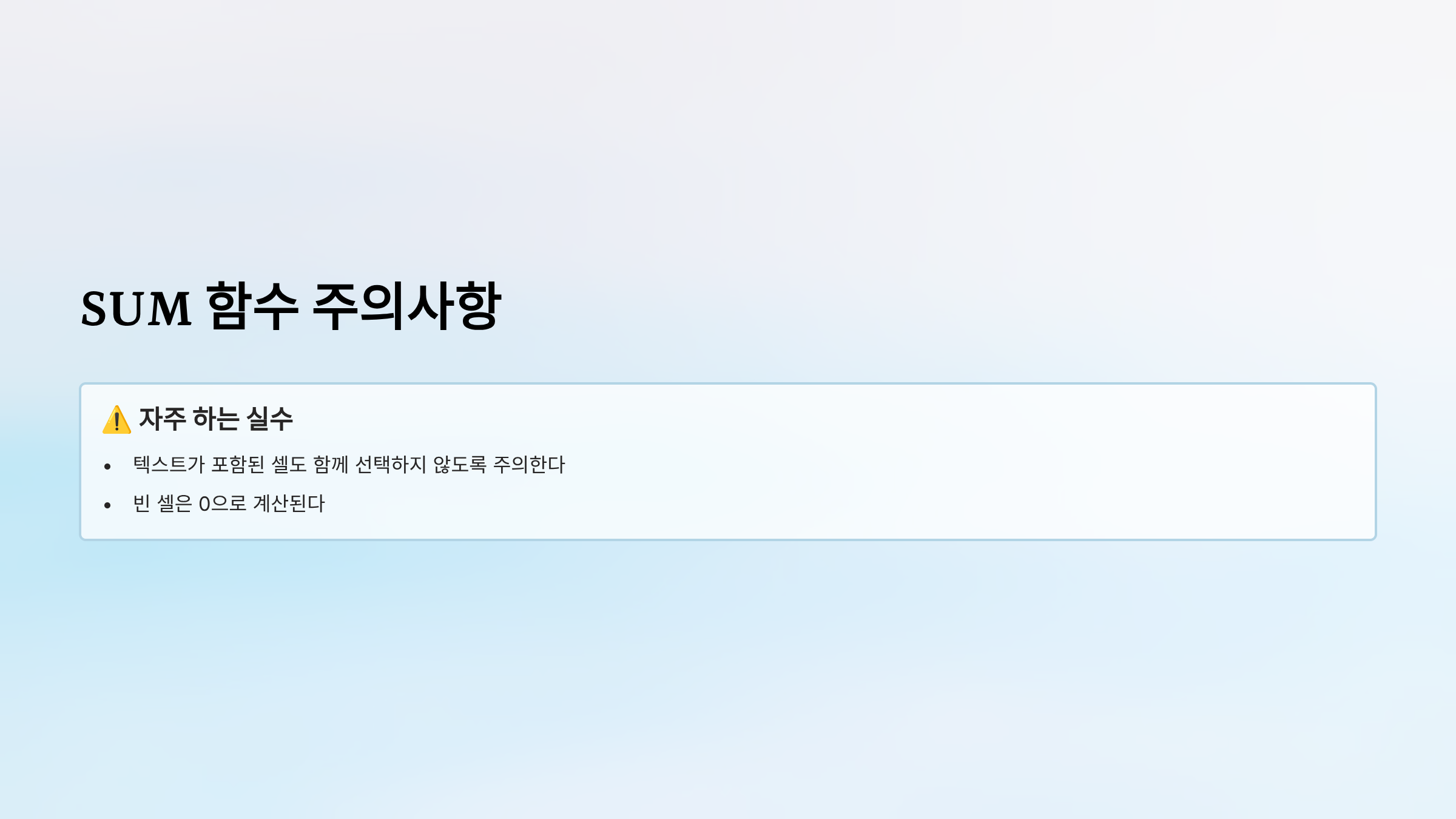가장 기본이면서도 가장 자주 쓰는 함수다. 급여 합계, 매출 합계, 비용 합계 등 모든 합계 계산에 사용된다. 특히 범위 선택 시 드래그로 쉽게 지정할 수 있다.