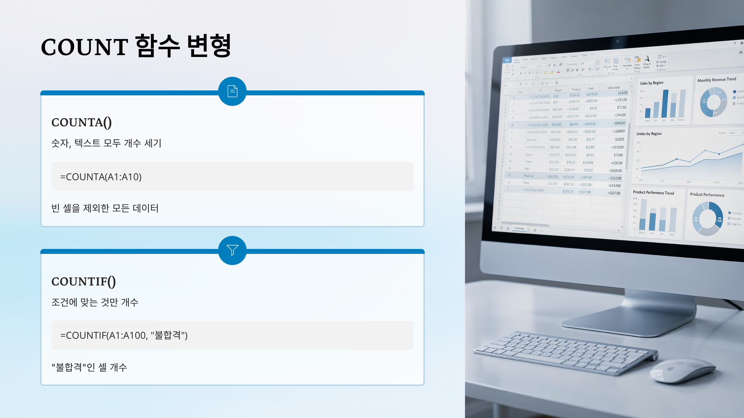 데이터가 얼마나 입력되었는지 확인할 때 사용한다. 월급명세서에서 실제 근무자가 몇 명인지, 판매 데이터에서 매출 기록이 몇 개인지 파악할 수 있다.