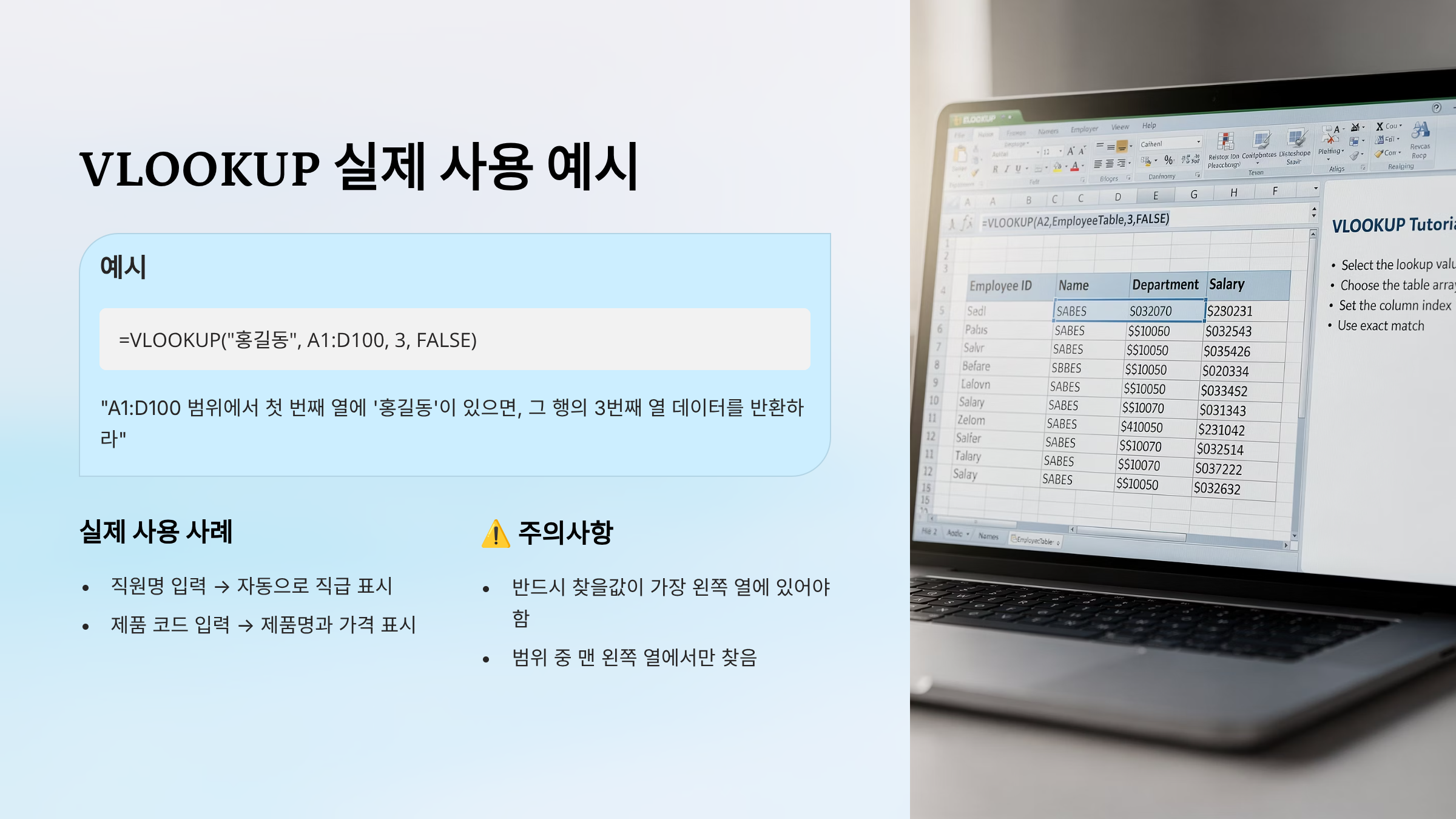 - 찾을값: 찾고자 하는 데이터 (예: 사원명, 제품코드)