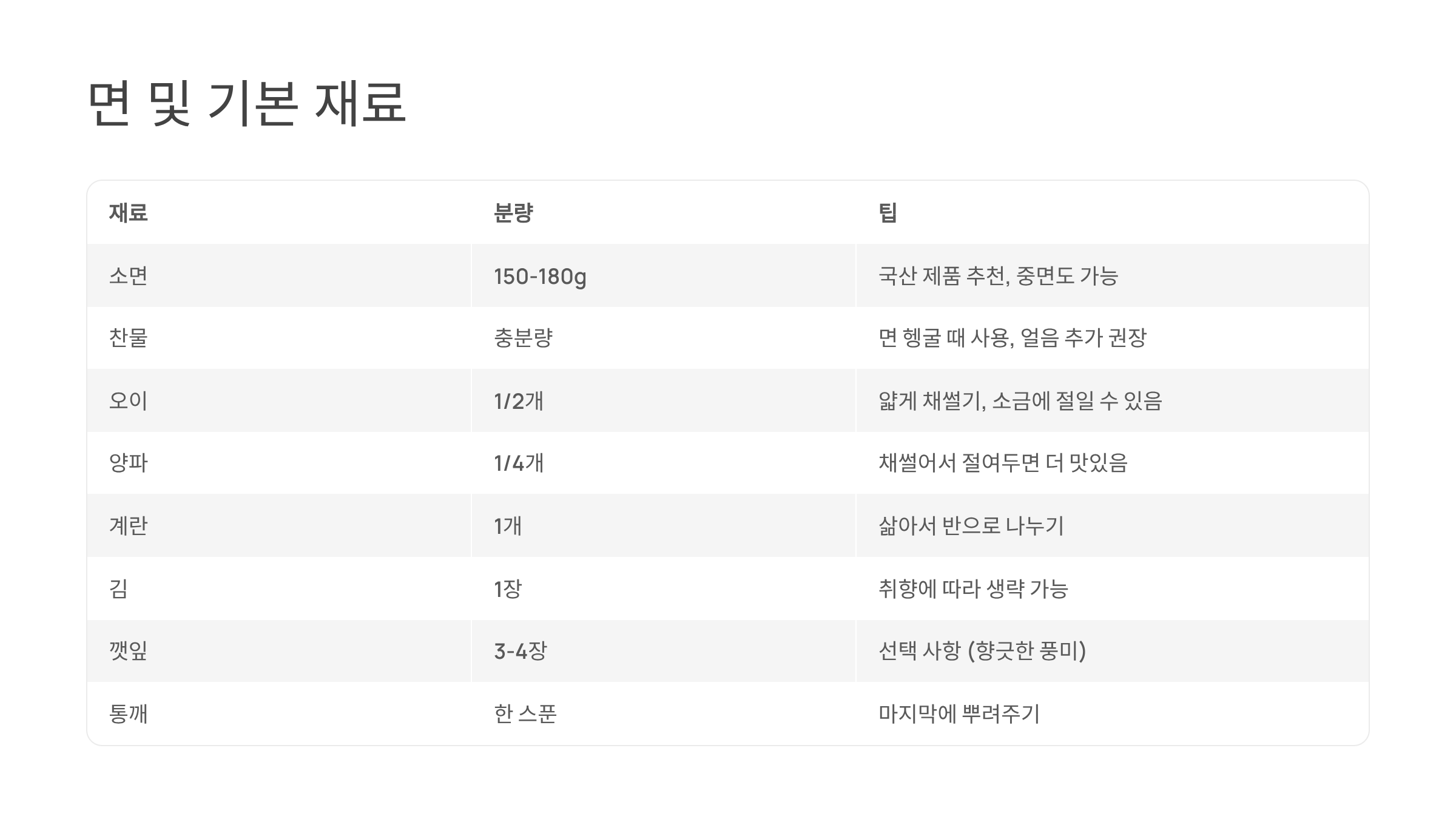 | 소면 | 150~180g | 국산 제품 추천, 중면도 가능 |
