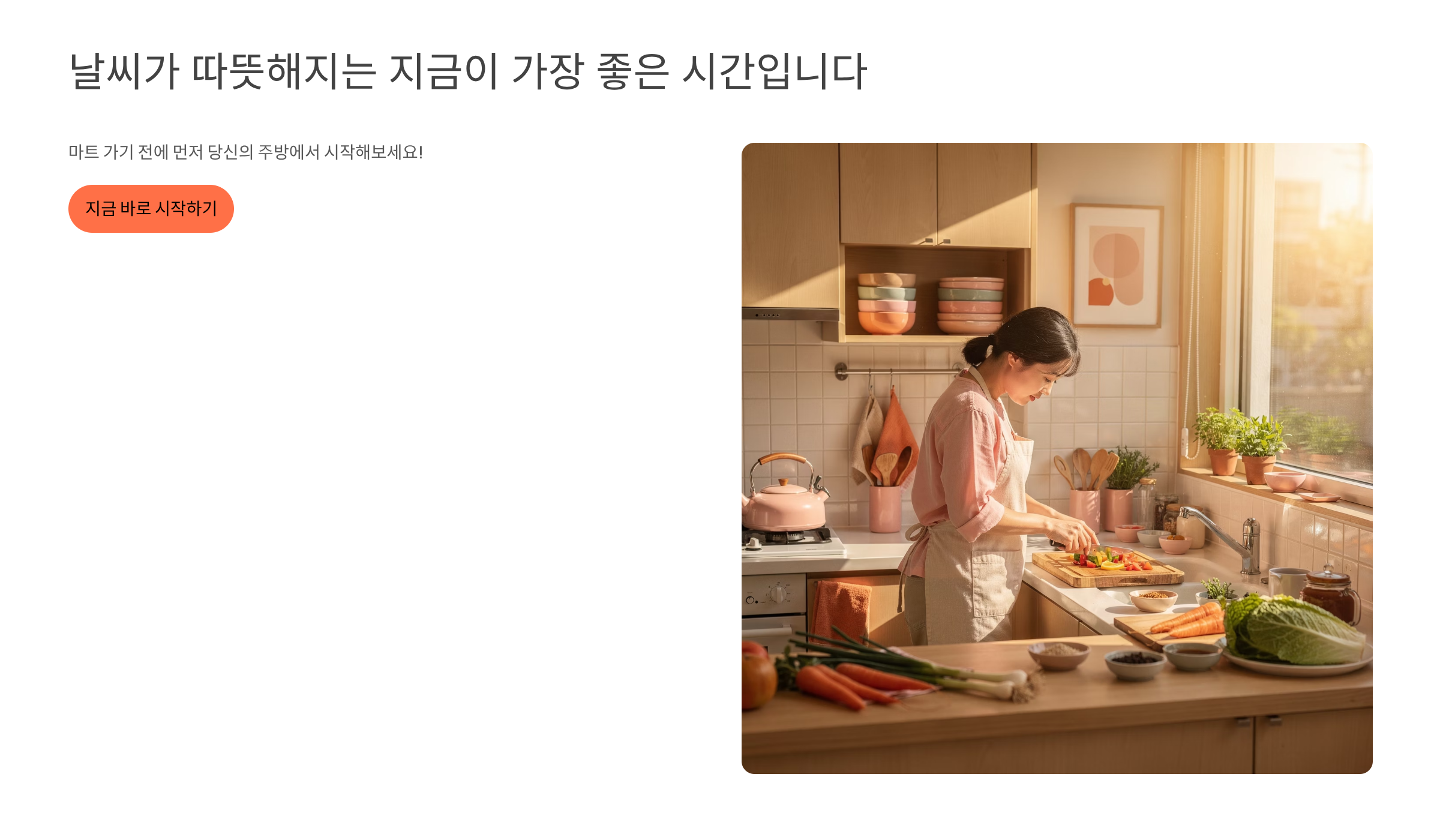 날씨가 따뜻해지는 지금이 가장 좋은 시간입니다. 마트 가기 전에 먼저 당신의 주방에서 시작해보세요!