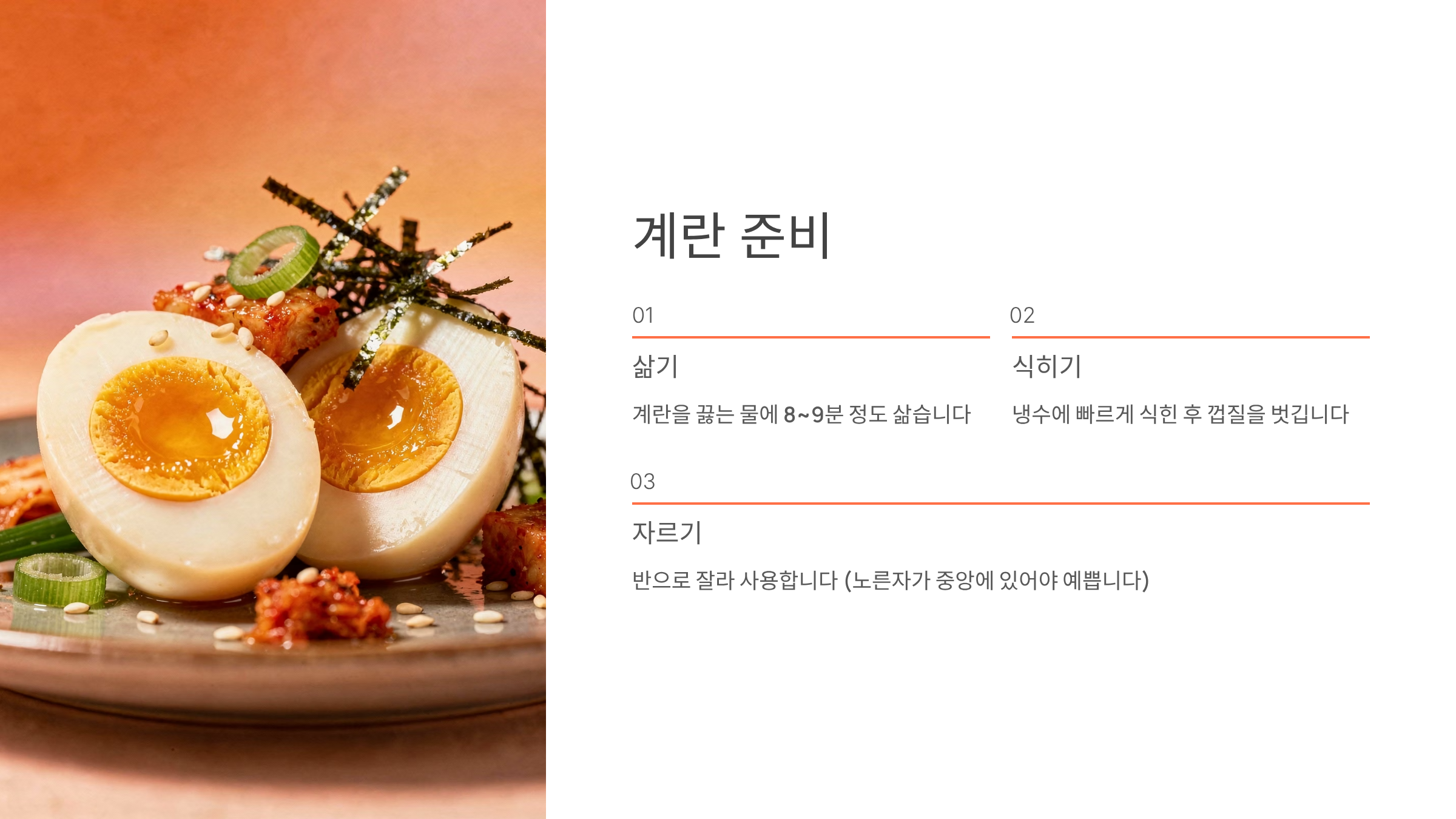 - 반으로 잘라 사용합니다 (노른자가 중앙에 있어야 예쁩니다).