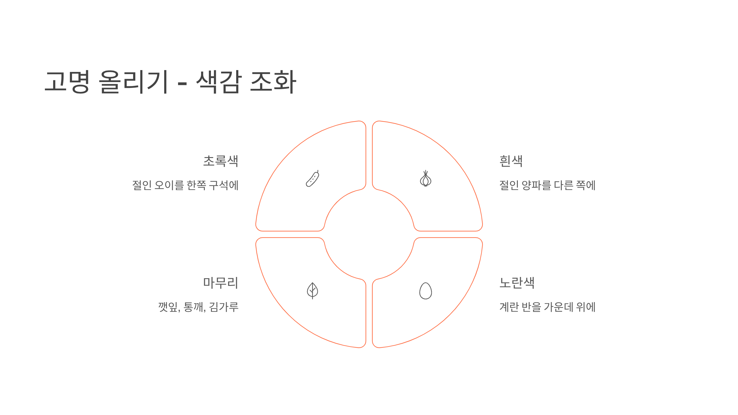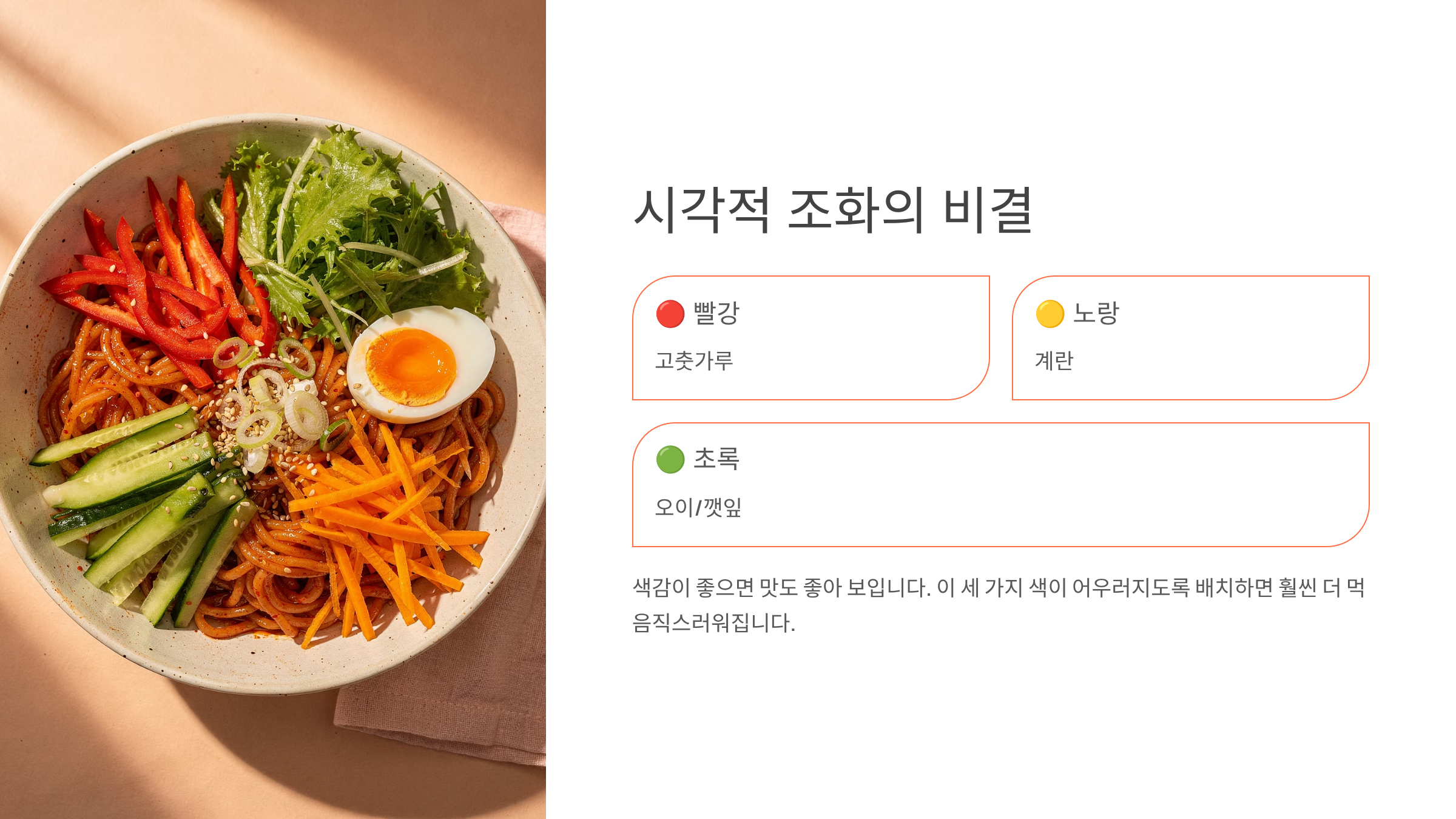 색감이 좋으면 맛도 좋아 보입니다. **빨강(고춧가루), 노랑(계란), 초록(오이/깻잎)**이 어우러지도록 배치하면 훨씬 더 먹음직스러워집니다.