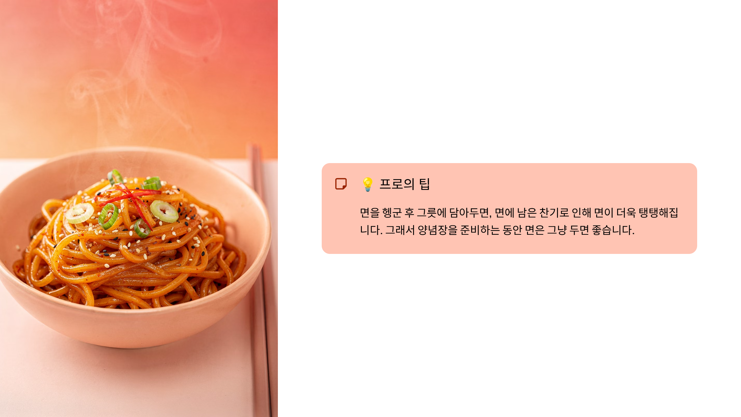 💡 프로의 팁: 면을 헹군 후 그릇에 담아두면, 면에 남은 찬기로 인해 면이 더욱 탱탱해집니다. 그래서 양념장을 준비하는 동안 면은 그냥 두면 좋습니다.