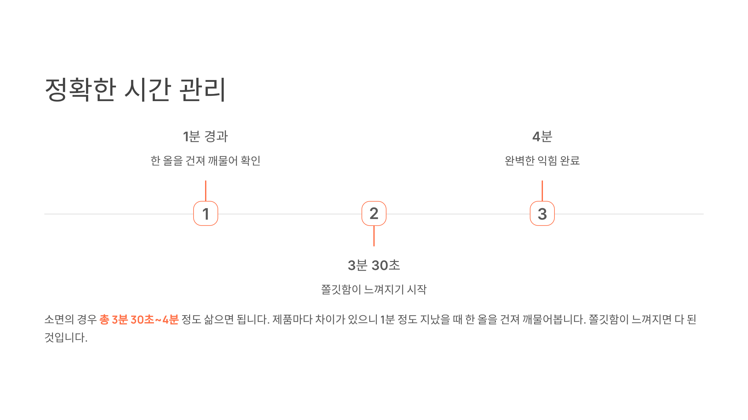 - 제품마다 차이가 있으니 1분 정도 지났을 때 한 올을 건져 깨물어봅니다.