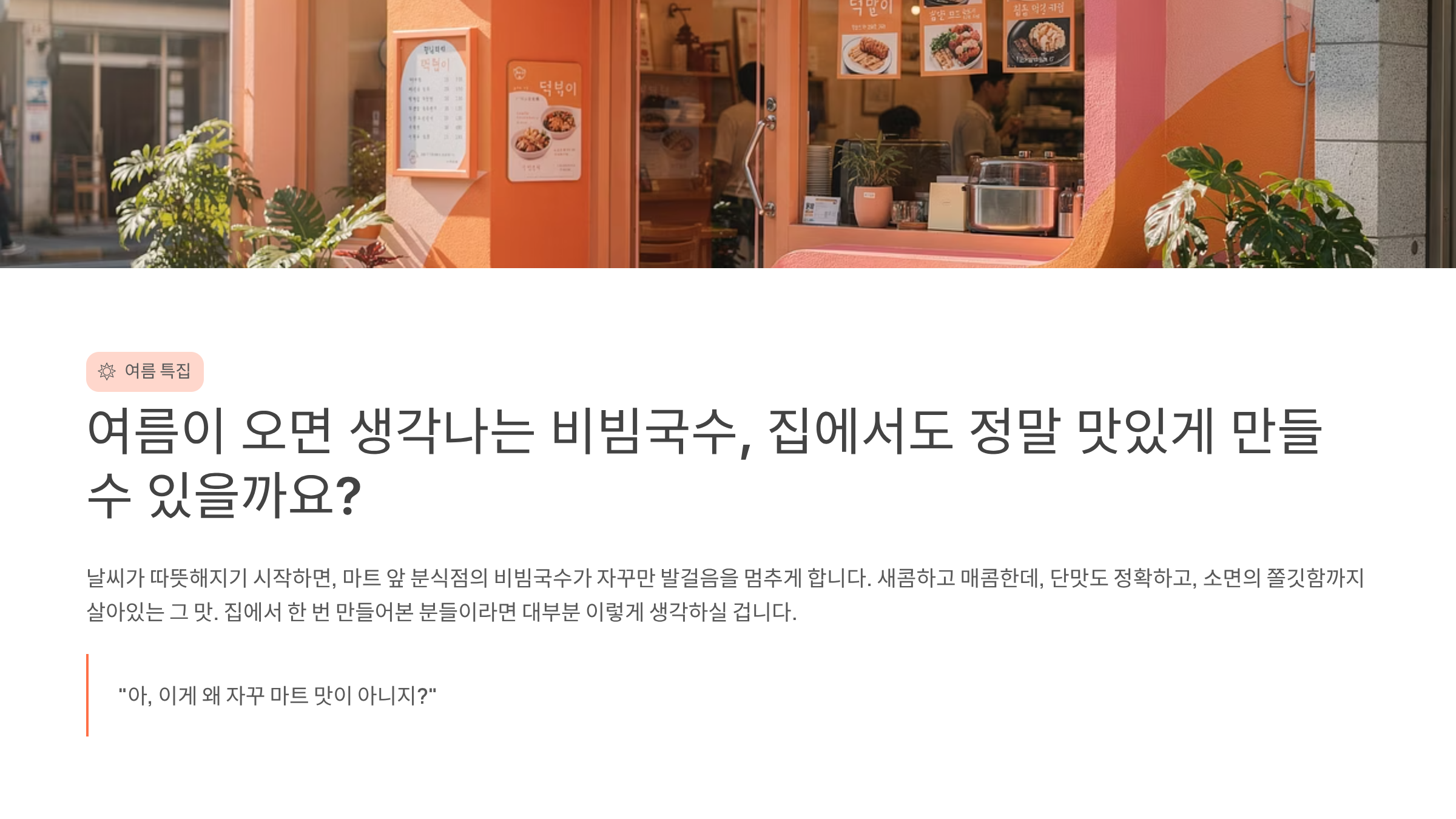 날씨가 따뜻해지기 시작하면, 마트 앞 분식점의 비빔국수가 자꾸만 발걸음을 멈추게 합니다. 새콤하고 매콤한데, 단맛도 정확하고, 소면의 쫄깃함까지 살아있는 그 맛. 집에서 한 번 만들어본 분들이라면 대부분 이렇게 생각하실 겁니다. "아, 이게 왜 자꾸 마트 맛이 아니지?"