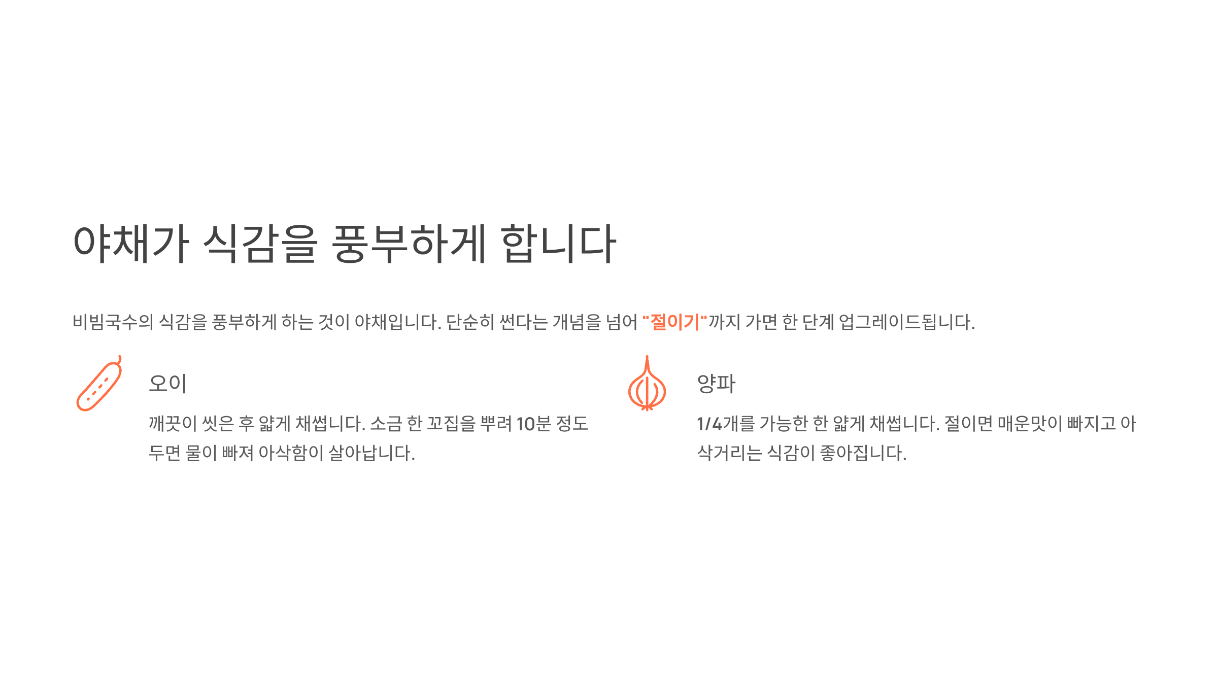 비빔국수의 식감을 풍부하게 하는 것이 야채입니다. 단순히 썬다는 개념을 넘어 "절이기"까지 가면 한 단계 업그레이드됩니다.