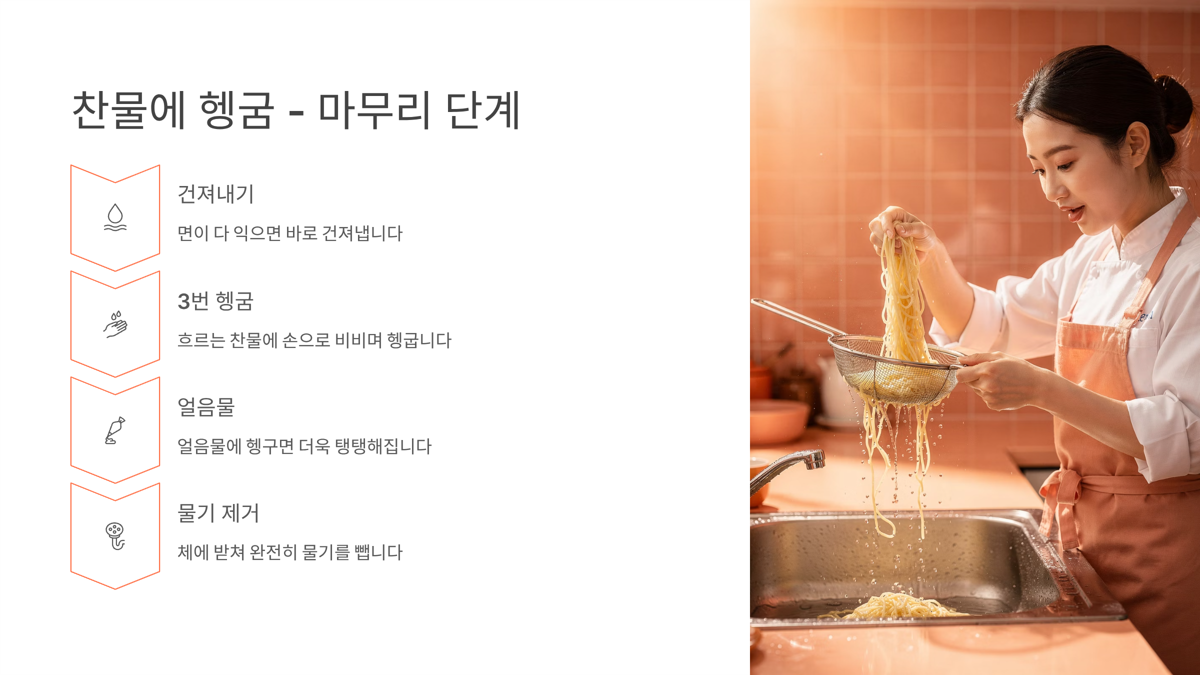 - 이 과정을 "찬물 충격법"이라고 하는데, 이것이 면을 탱탱하게 유지하는 비결입니다.