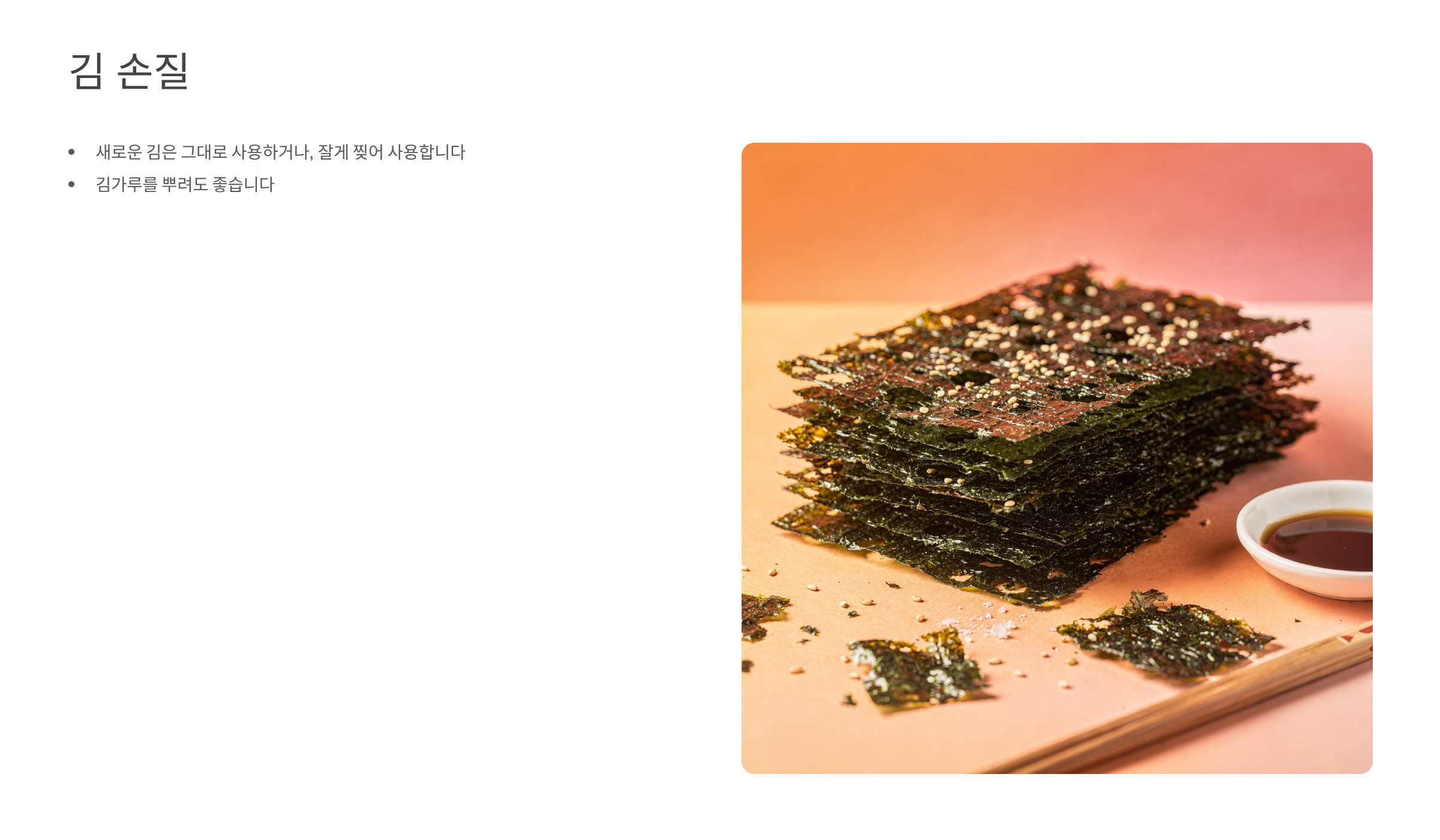 - 새로운 김은 그대로 사용하거나, 잘게 찢어 사용합니다.
