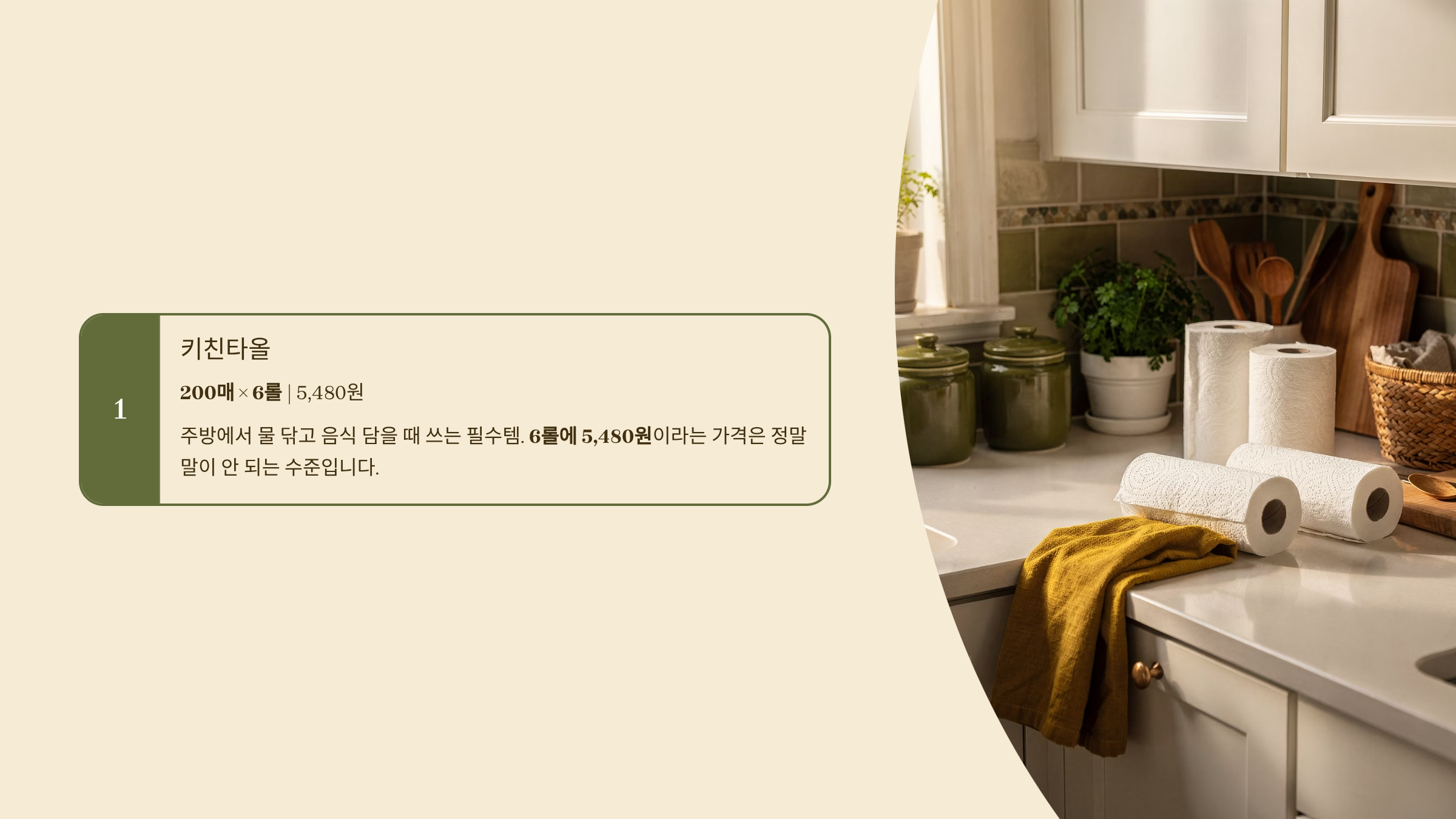 주방에서 물 닦고 음식 담을 때 쓰는 필수템. 6롤에 5,480원이라는 가격은 정말 말이 안 되는 수준입니다.