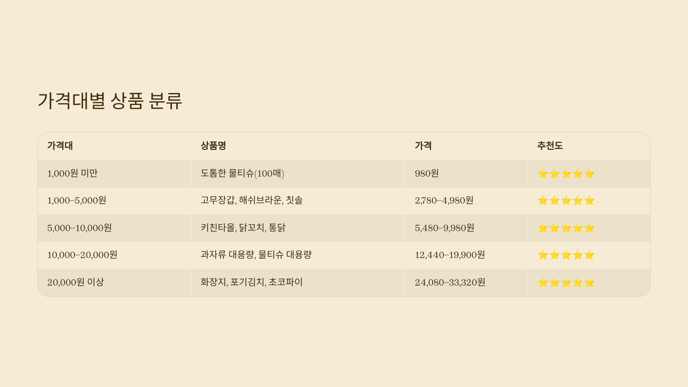 | 1,000~5,000원 | 고무장갑, 해쉬브라운, 칫솔 | 2,780~4,980원 | ⭐⭐⭐⭐⭐ |