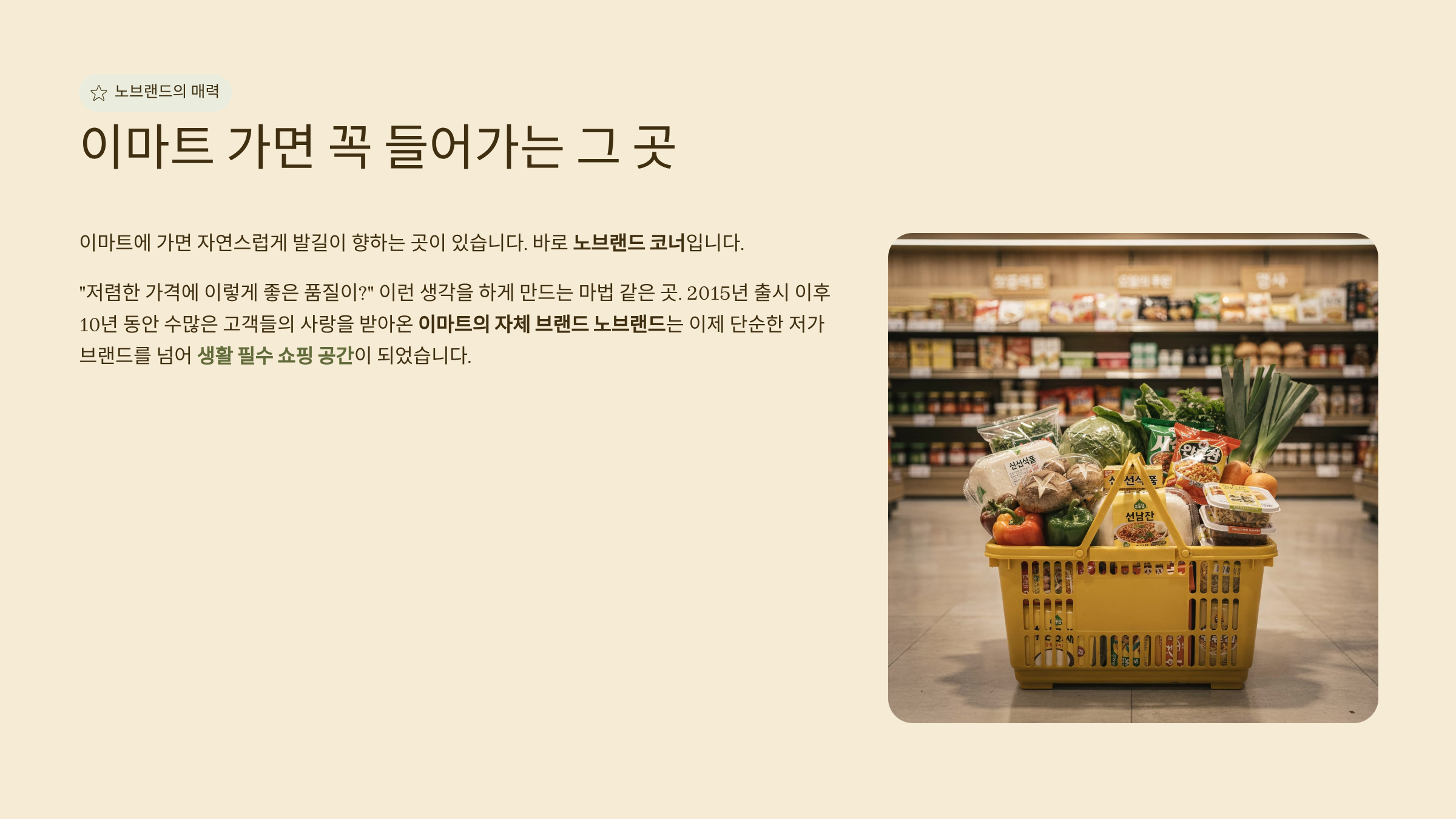 "저렴한 가격에 이렇게 좋은 품질이?" 이런 생각을 하게 만드는 마법 같은 곳. 2015년 출시 이후 10년 동안 수많은 고객들의 사랑을 받아온 이마트의 자체 브랜드 노브랜드는 이제 단순한 저가 브랜드를 넘어 생활 필수 쇼핑 공간이 되었습니다.