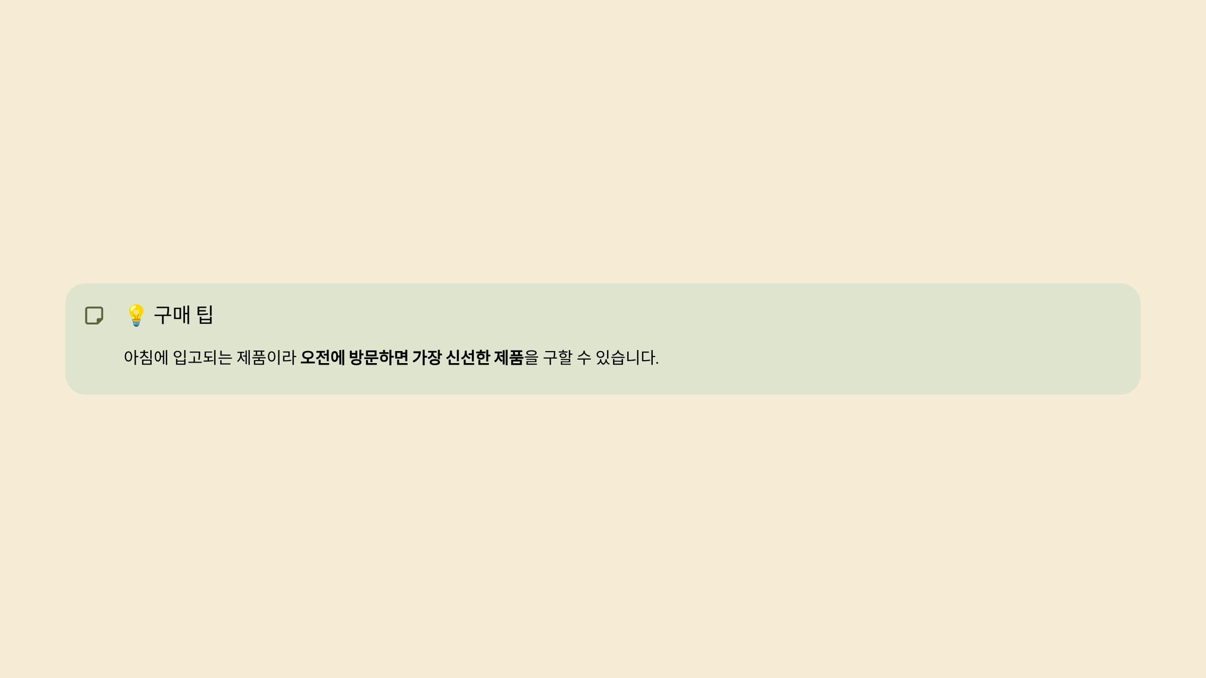 구매 팁: 아침에 입고되는 제품이라 오전에 방문하면 가장 신선한 제품을 구할 수 있습니다.