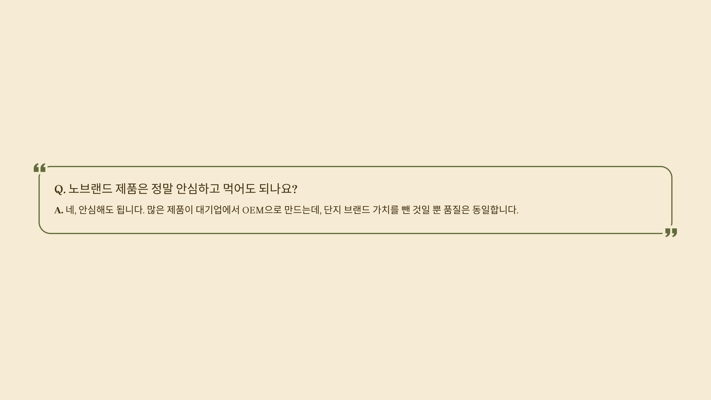A. 네, 안심해도 됩니다. 많은 제품이 대기업에서 OEM으로 만드는데, 단지 브랜드 가치를 뺀 것일 뿐 품질은 동일합니다.