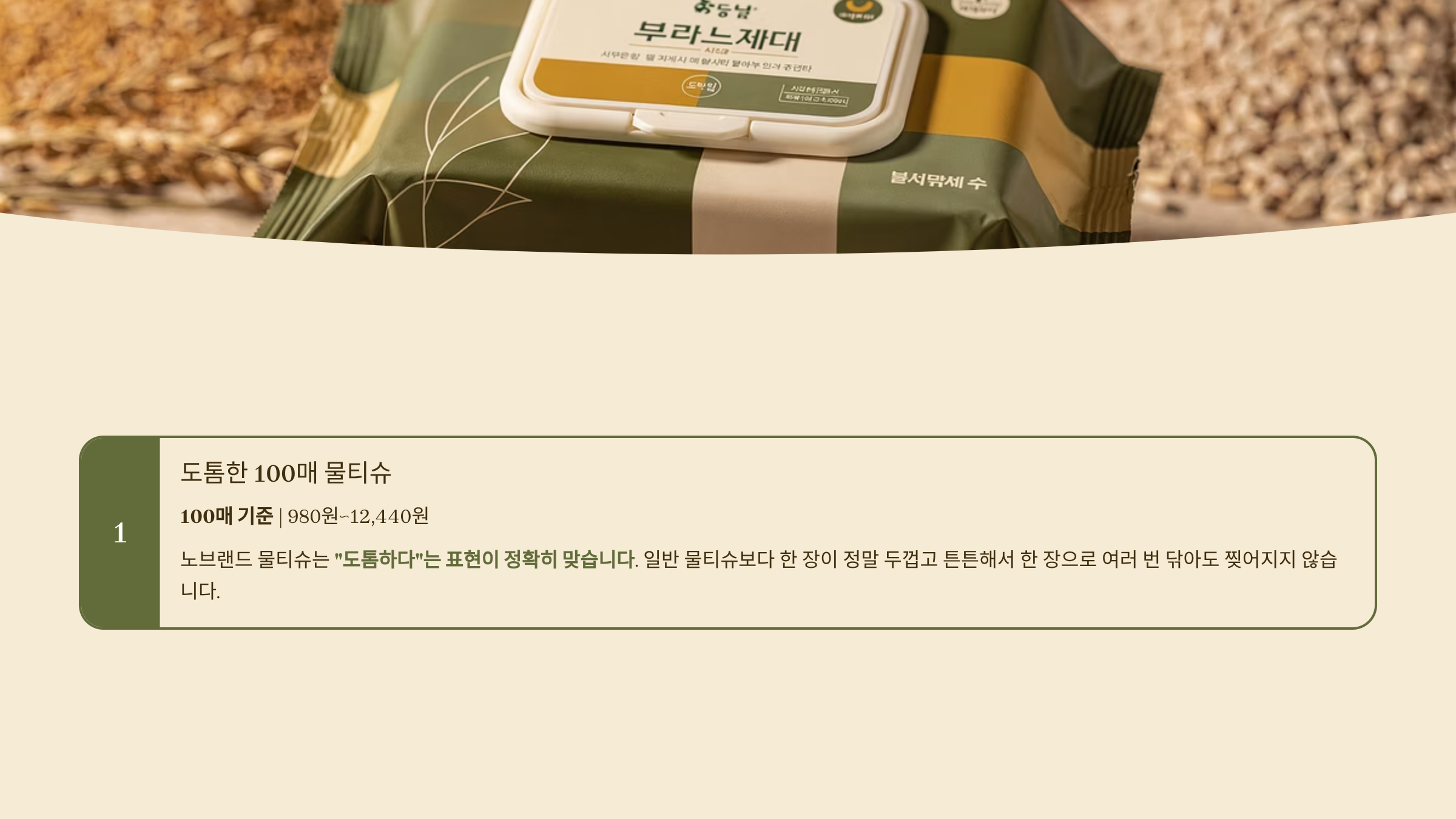 노브랜드 물티슈는 "도톰하다"는 표현이 정확히 맞습니다. 일반 물티슈보다 한 장이 정말 두껍고 튼튼해서 한 장으로 여러 번 닦아도 찢어지지 않습니다.
