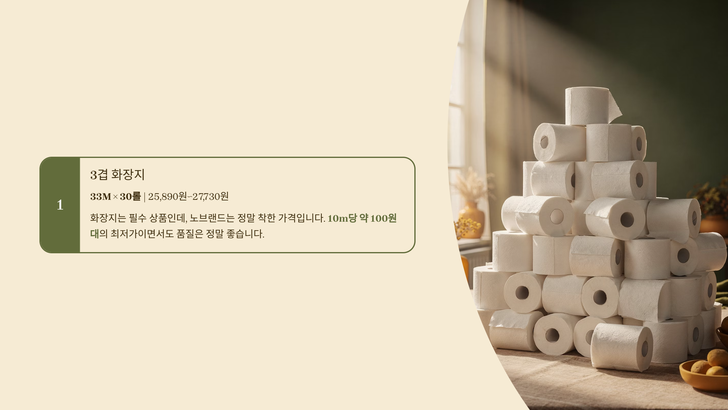 - 노브랜드: 25,890원 (30롤, 같은 두께) → 15% 저렴 + 50% 더 많음