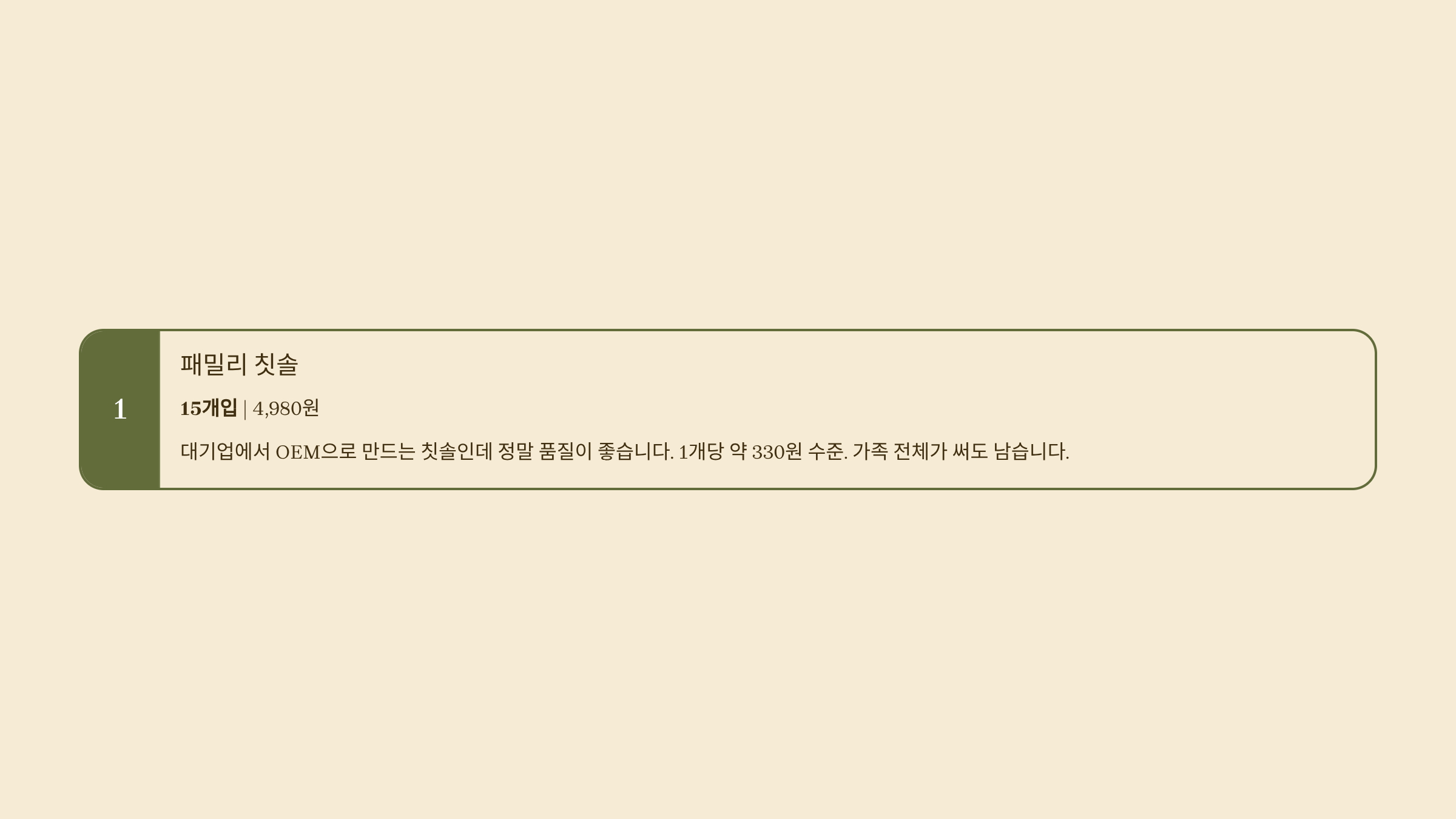 대기업에서 OEM으로 만드는 칫솔인데 정말 품질이 좋습니다. 1개당 약 330원 수준. 가족 전체가 써도 남습니다.