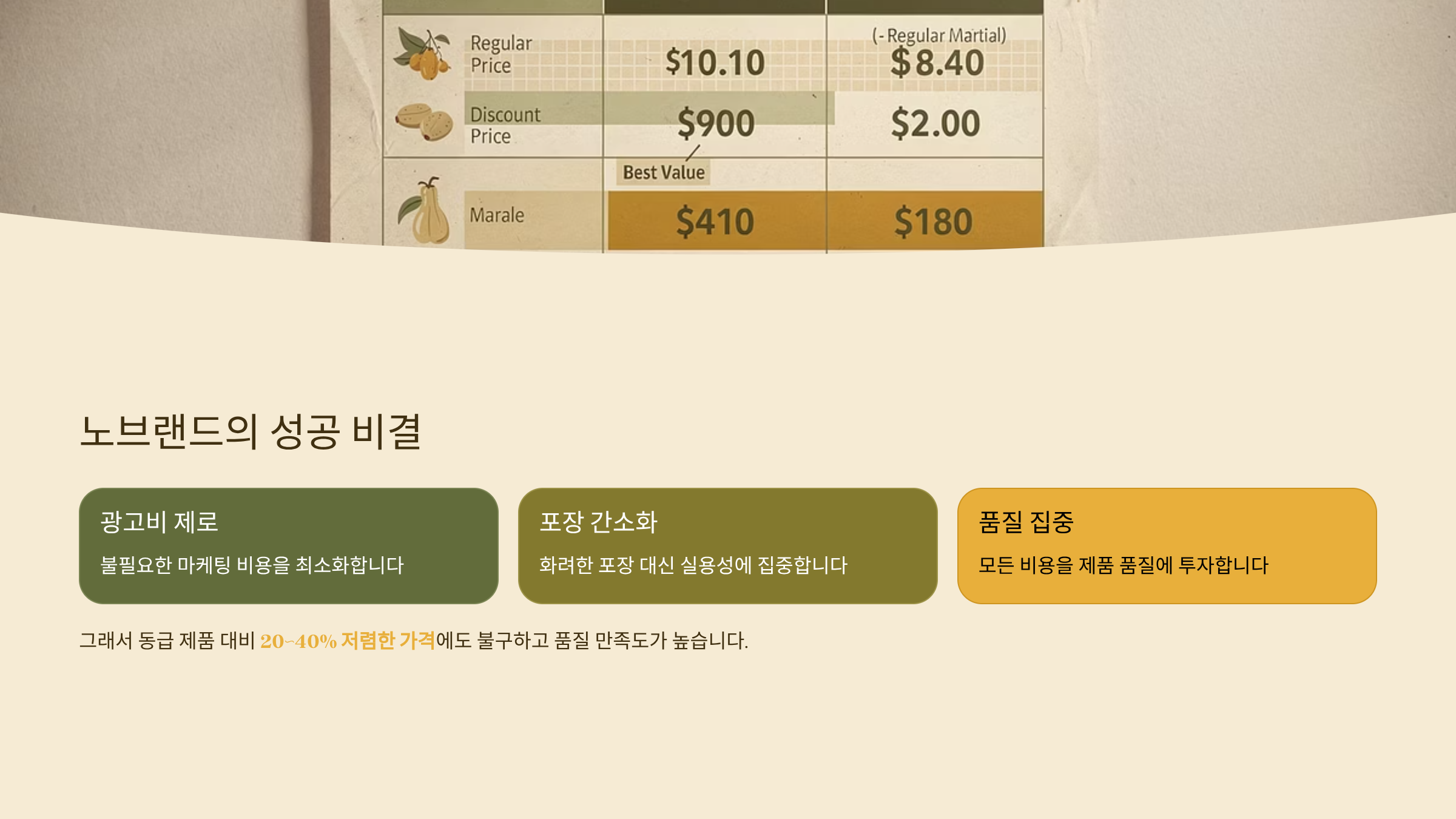 노브랜드의 비결은 간단합니다. 광고와 포장, 그리고 불필요한 마케팅 비용을 최소화하고, 모든 비용을 제품 품질에 집중하는 것입니다. 그래서 동급 제품 대비 20~40% 저렴한 가격에도 불구하고 품질 만족도가 높습니다.