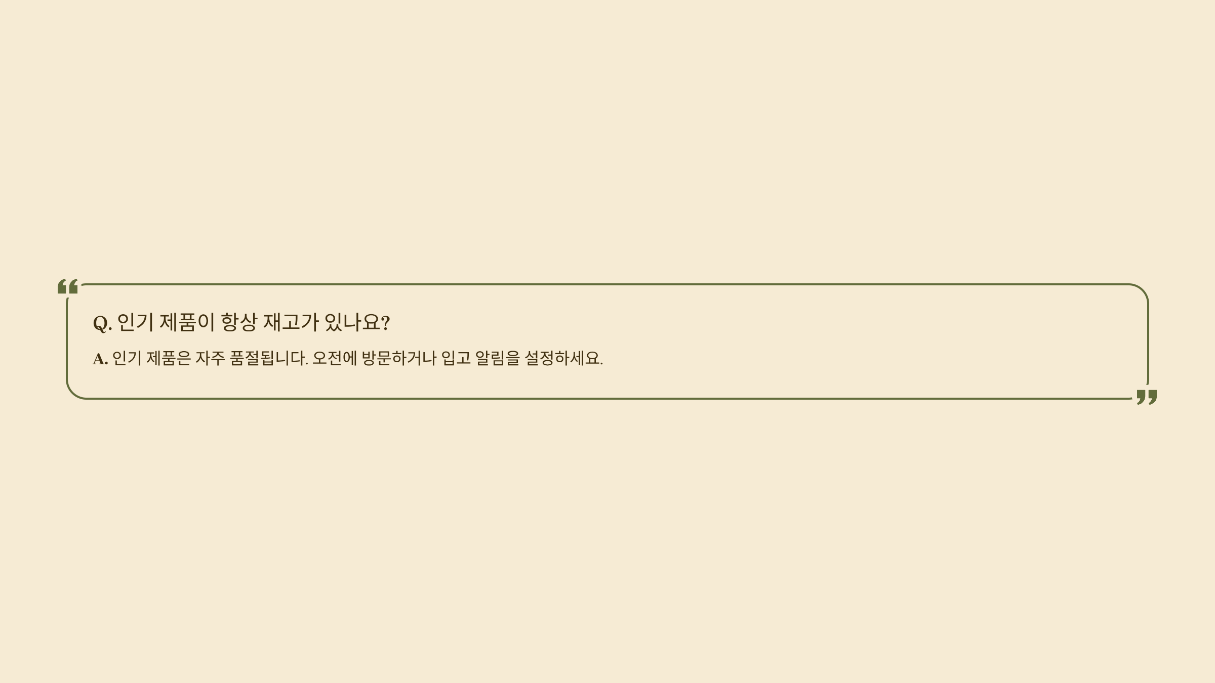 A. 인기 제품은 자주 품절됩니다. 오전에 방문하거나 입고 알림을 설정하세요.