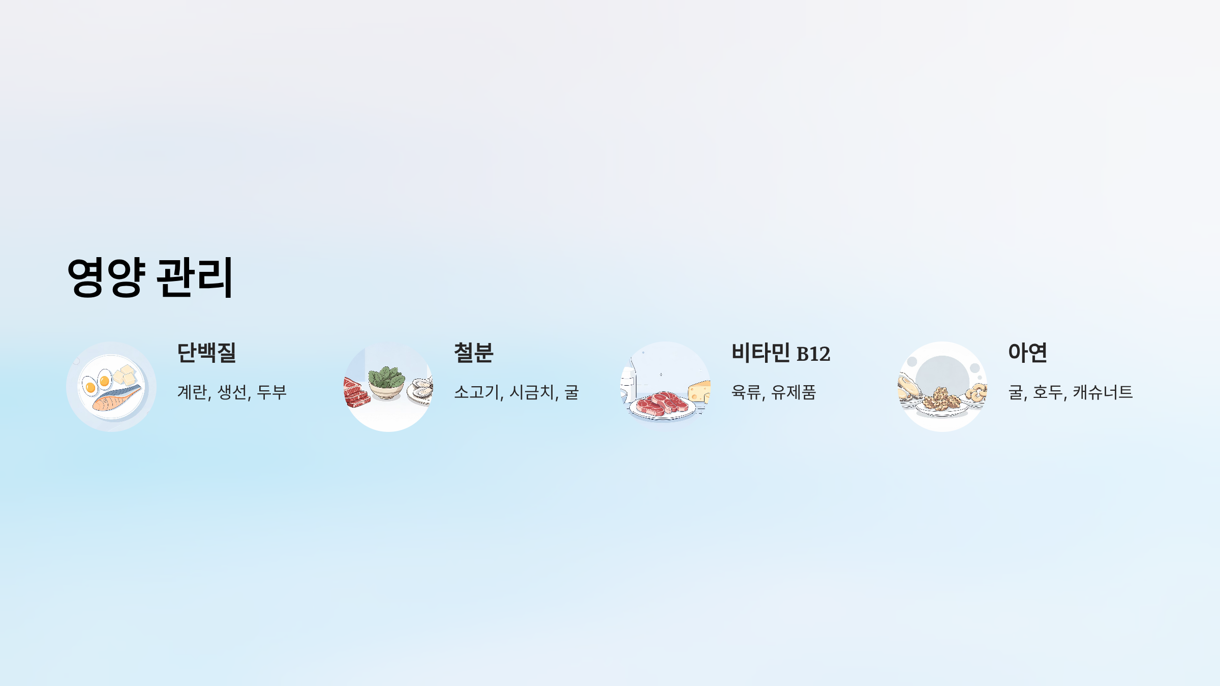 - 단백질, 철분, 비타민 B12 부족