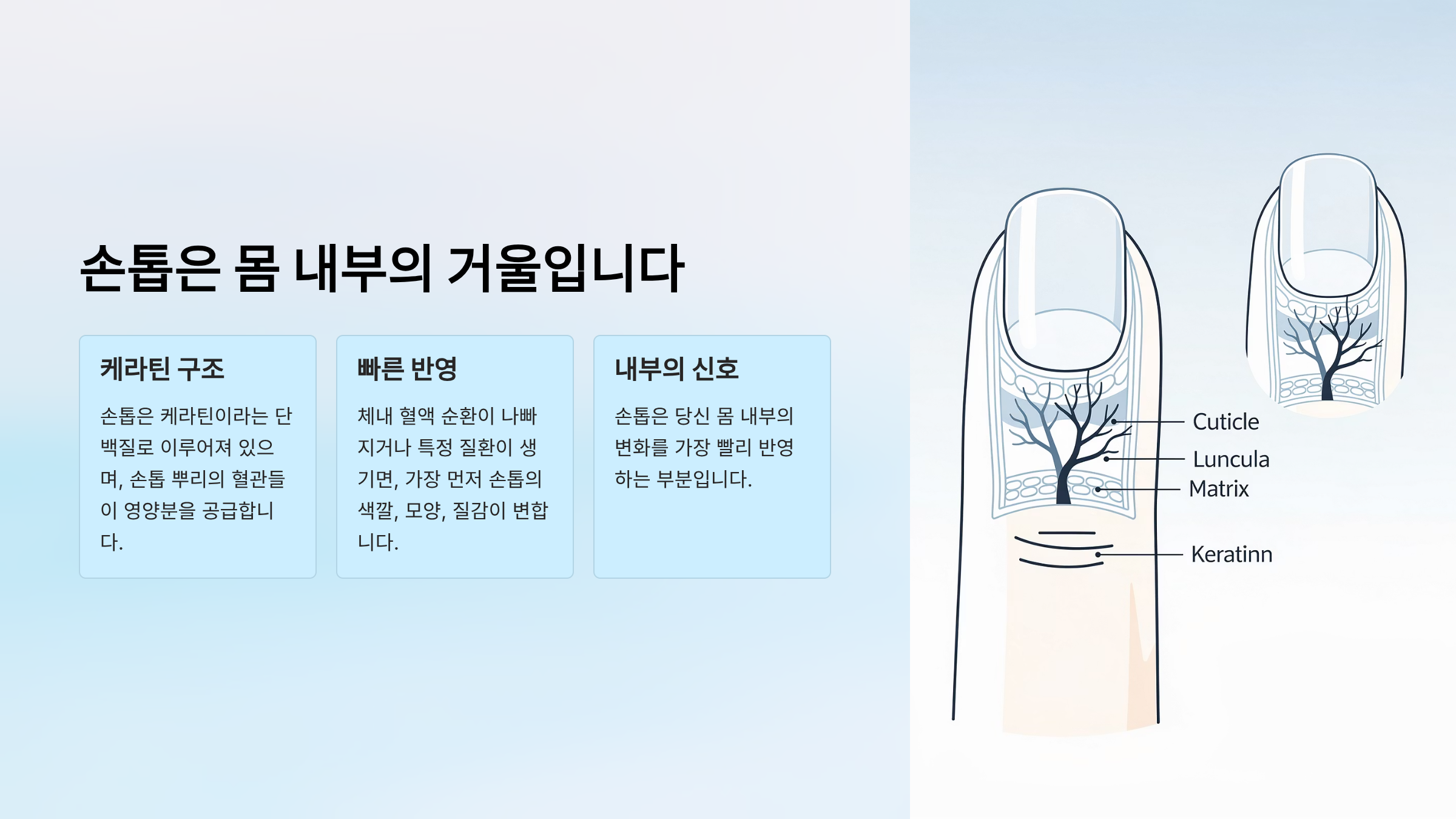 손톱은 케라틴이라는 단백질로 이루어져 있으며, 손톱 뿌리의 혈관들이 영양분을 공급합니다. 따라서 체내 혈액 순환이 나빠지거나 특정 질환이 생기면, 가장 먼저 손톱의 색깔, 모양, 질감이 변합니다.