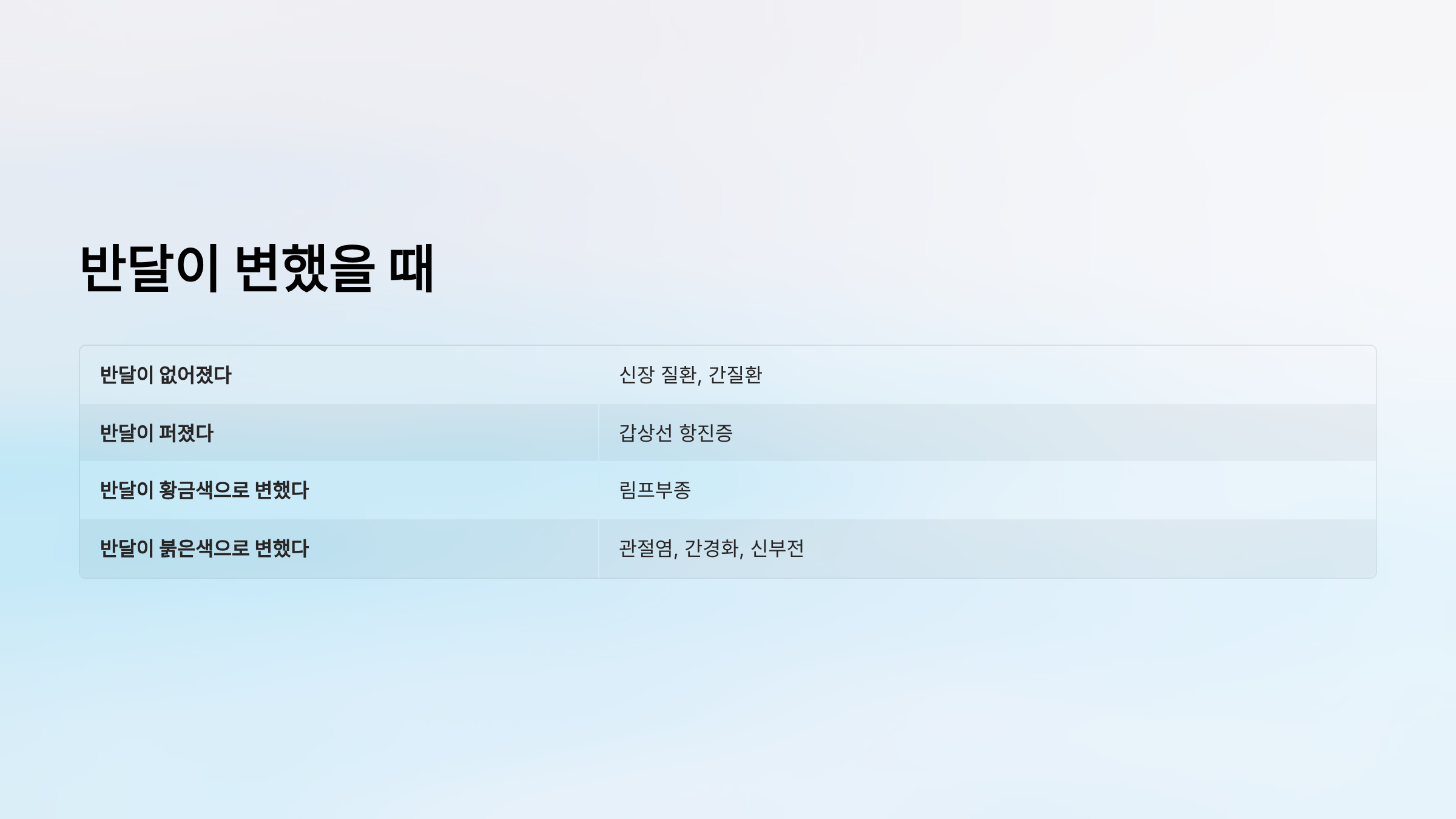| 반달이 붉은색으로 변했다 | 관절염, 간경화, 신부전 |