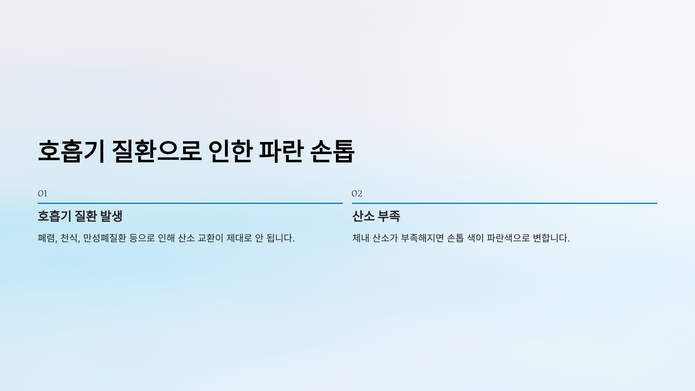 - 폐렴, 천식, 만성폐질환 등으로 인해 산소 교환이 제대로 안 됩니다