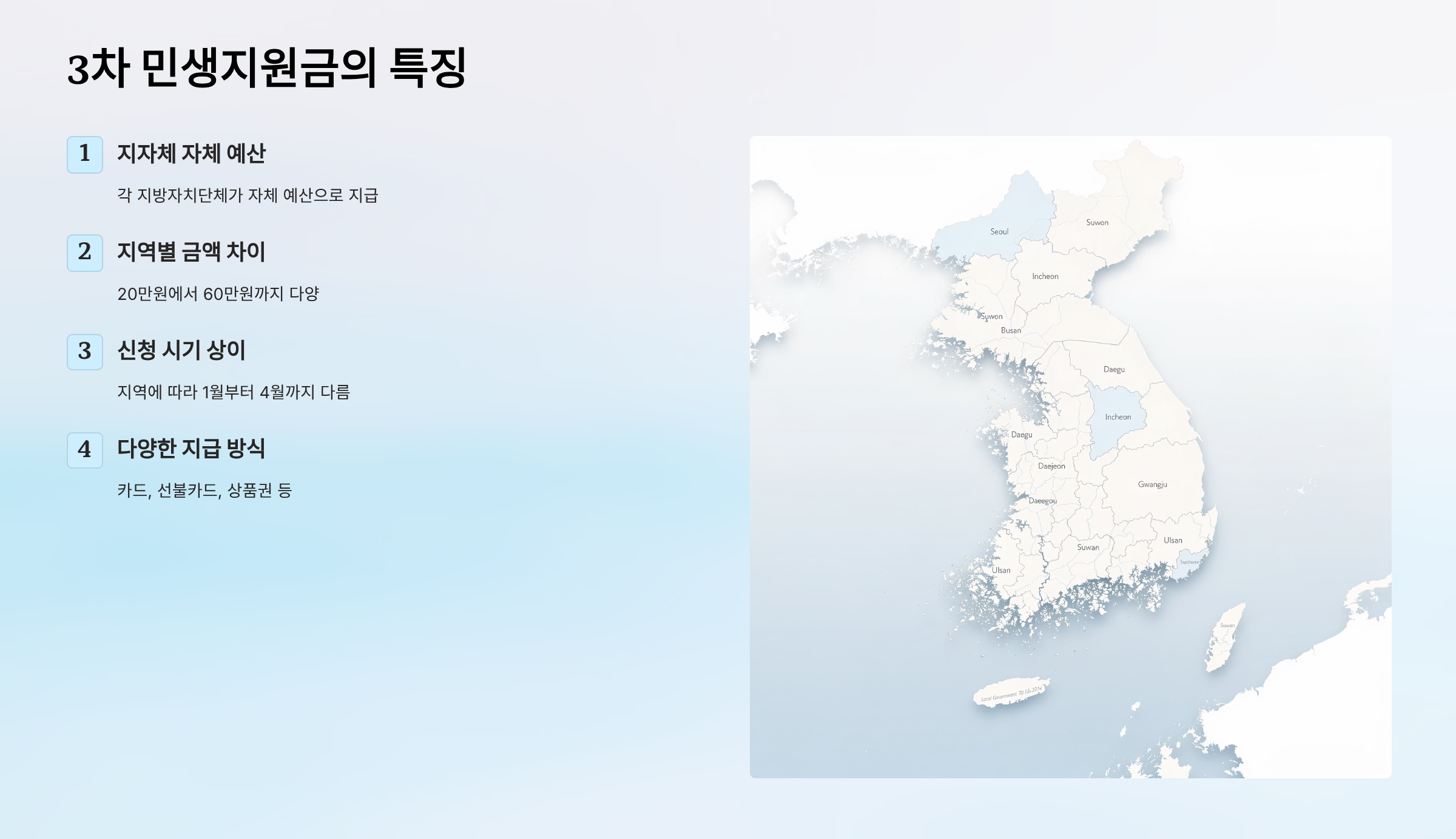 - 지역에 따라 지급 방식이 다름 (카드, 선불카드, 상품권 등)