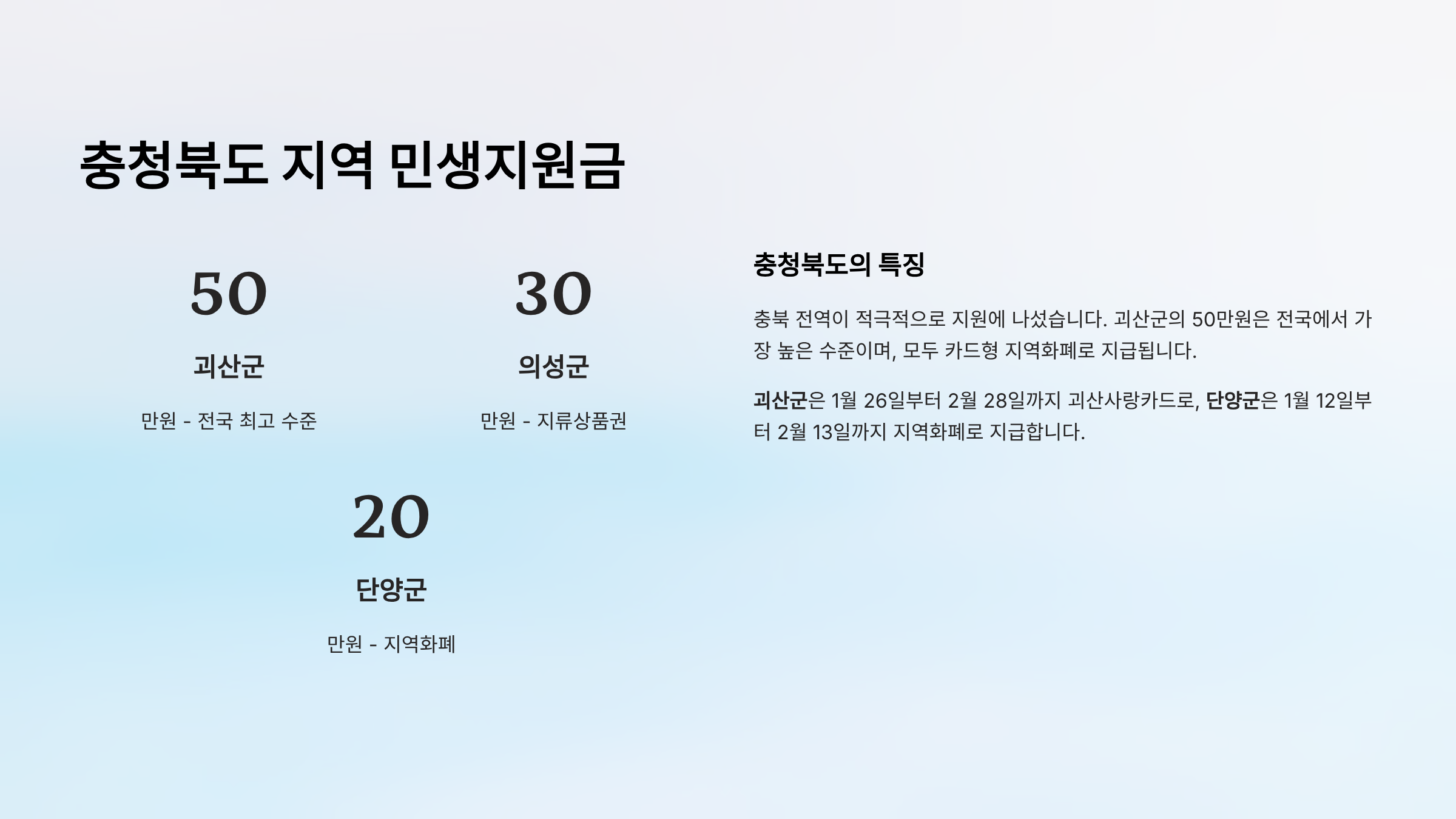 | 괴산군 | 50만원 | 1월 26일~2월 28일 | 괴산사랑카드 | 높은 지급액 |
