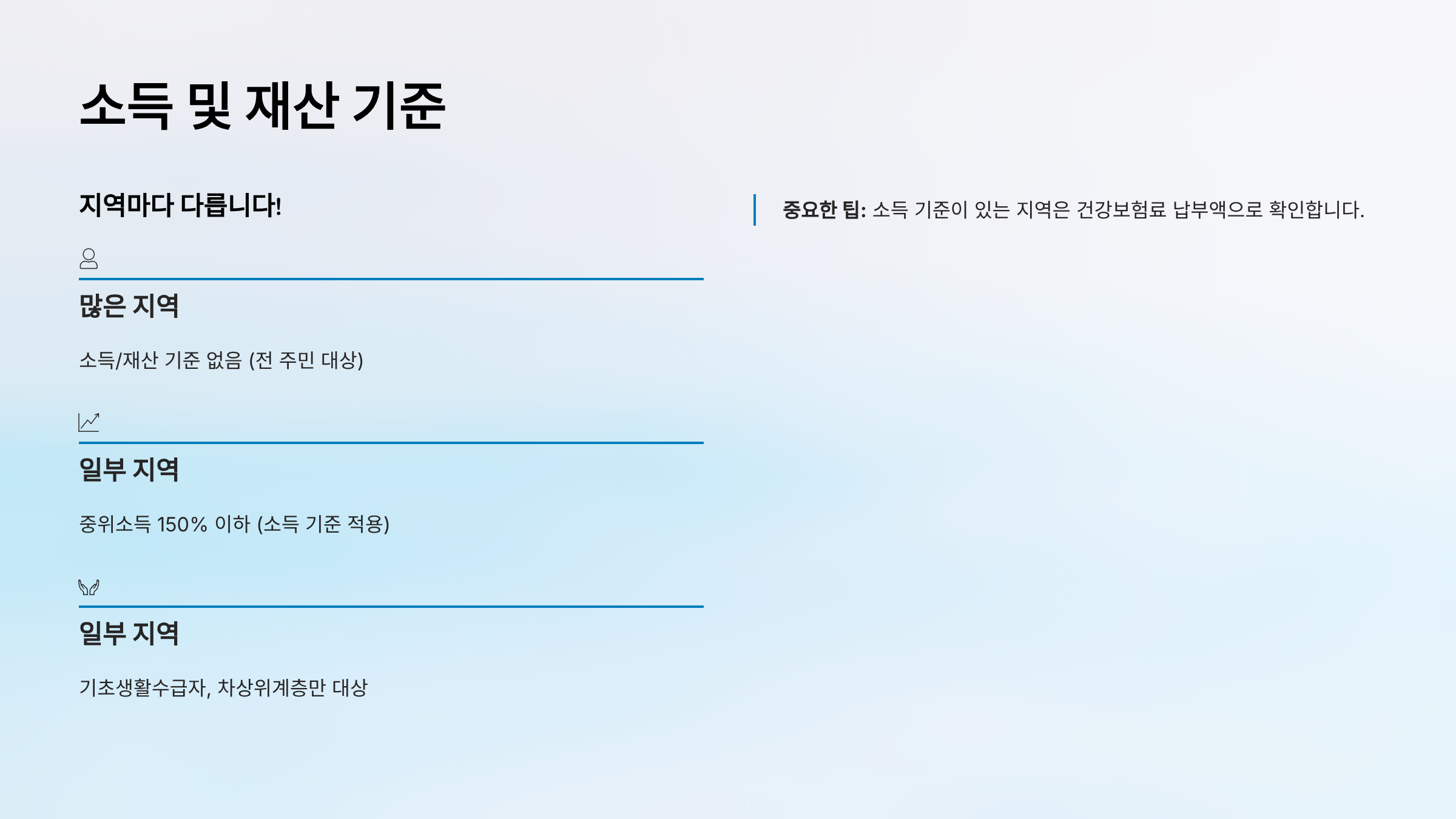 중요한 팁: 소득 기준이 있는 지역은 건강보험료 납부액으로 확인합니다.