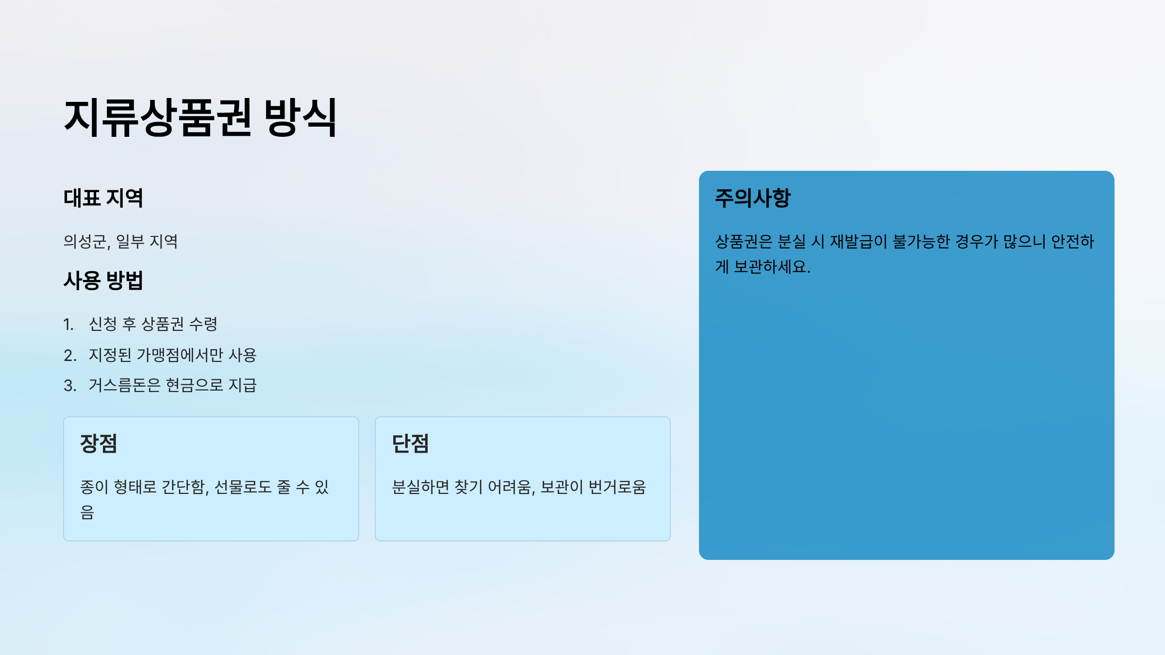 | 사용 가능 처 | 지역 소상공인 위주 (대형마트, 온라인쇼핑 불가) |