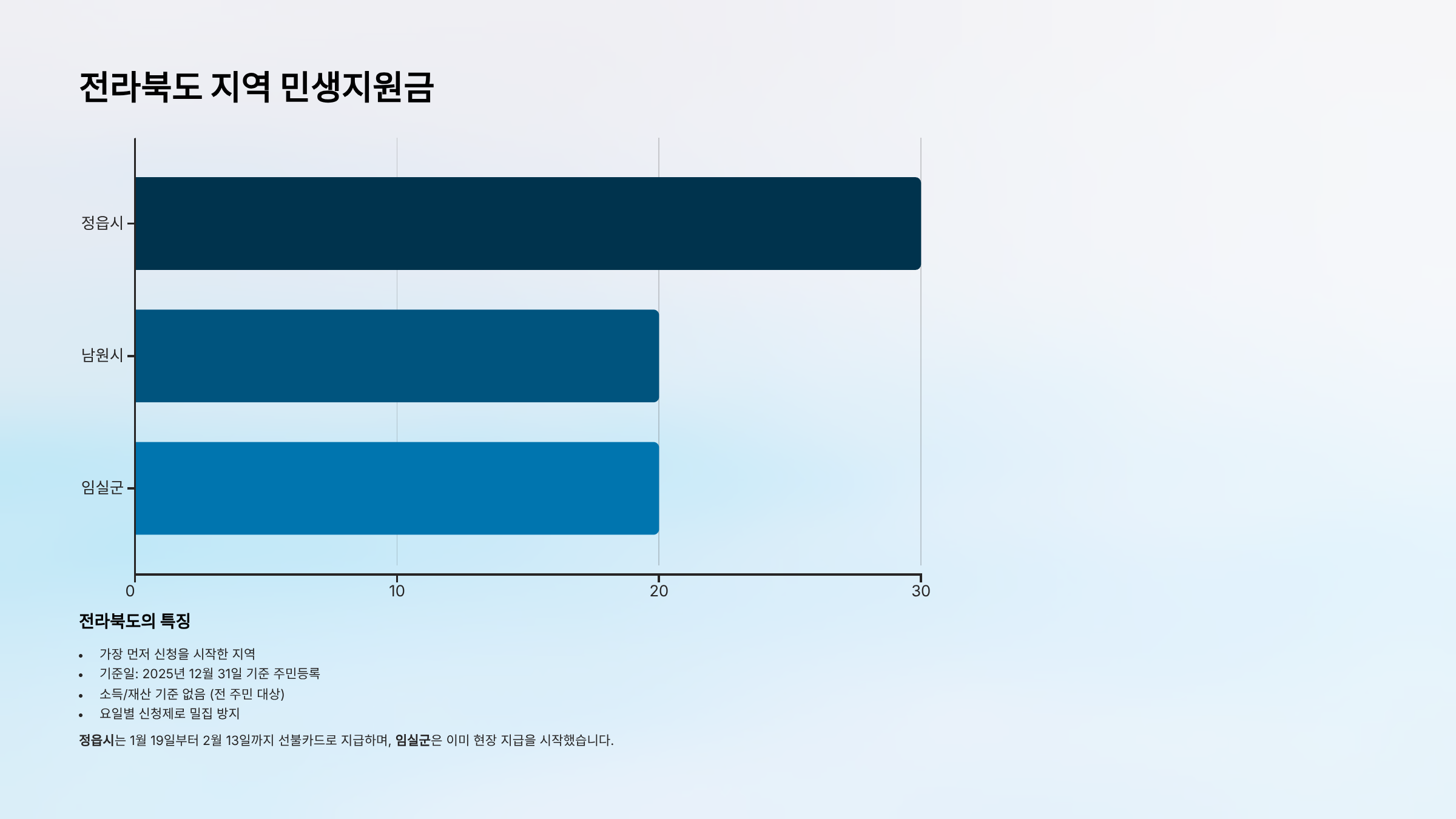 | 정읍시 | 30만원 | 1월 19일~2월 13일 | 선불카드 | 우선 지급, 요일제 적용 |