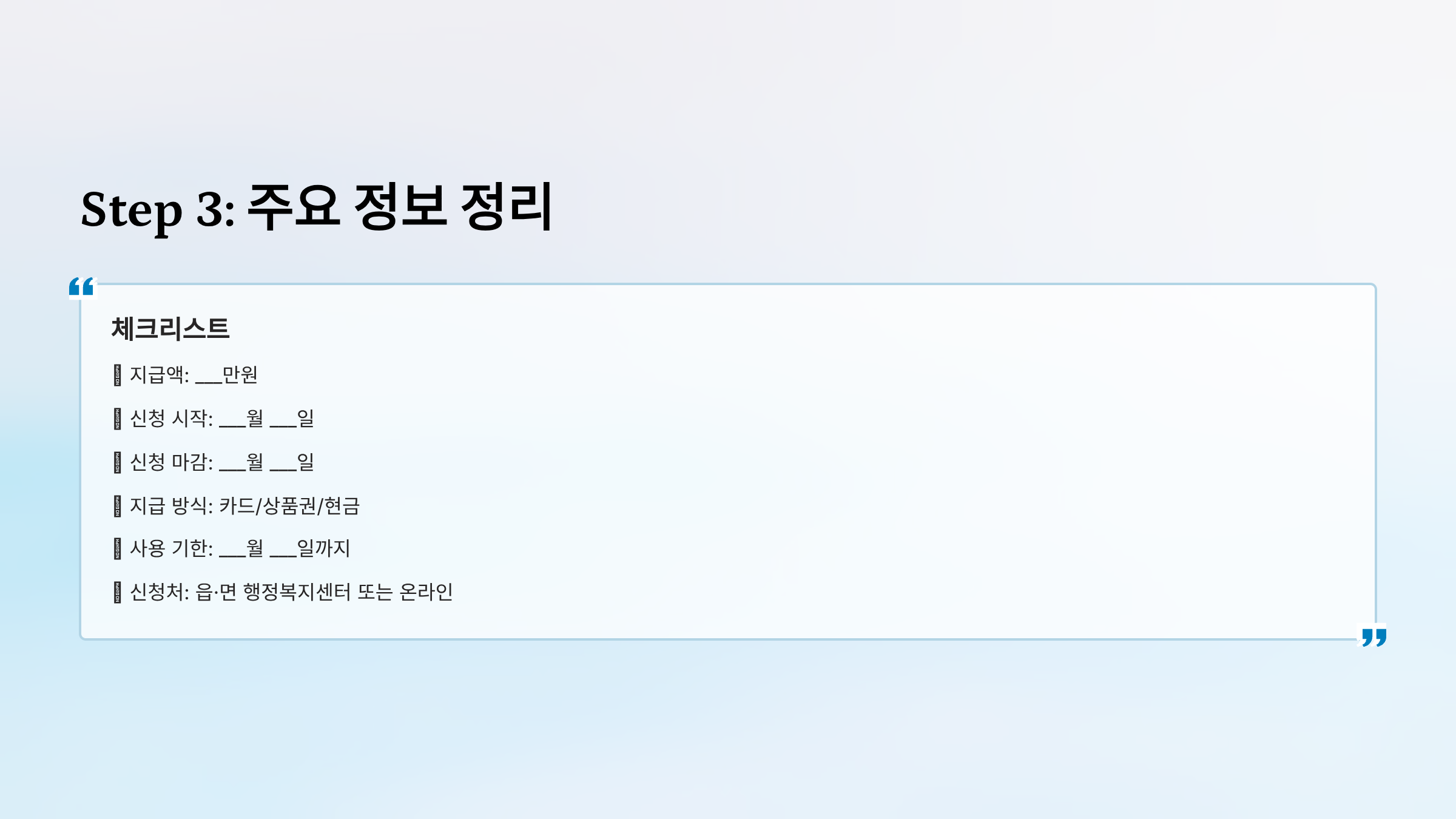 2️⃣ 신청 시기, 지급액, 신청처 정확히 기록