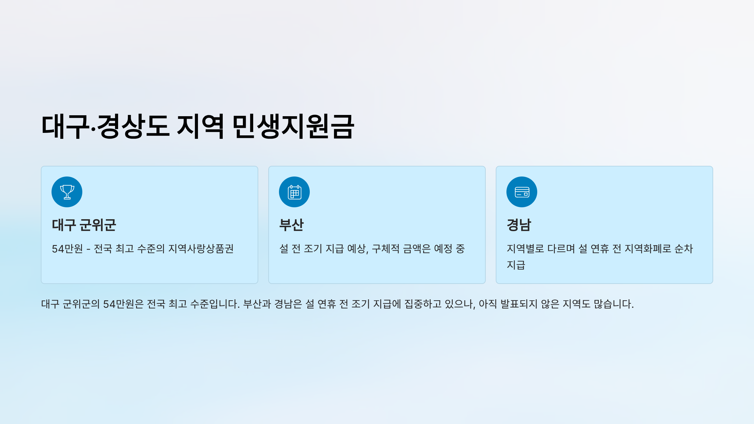 | 대구 군위군 | 54만원 | 예정 중 | 지역사랑상품권 | 최고 수준 |