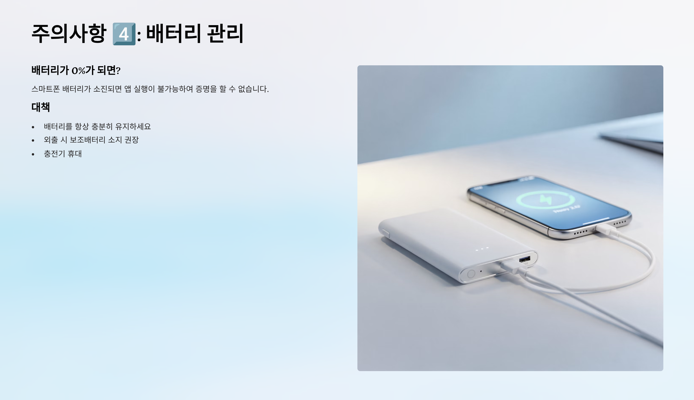대책: 배터리를 항상 충분히 유지하세요. 외출 시 보조배터리 소지 권장.
