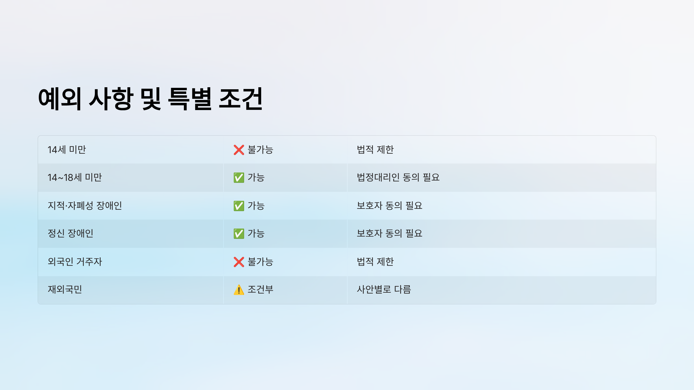 | 정신 장애인 | ✅ 가능 | 보호자 동의 필요 |