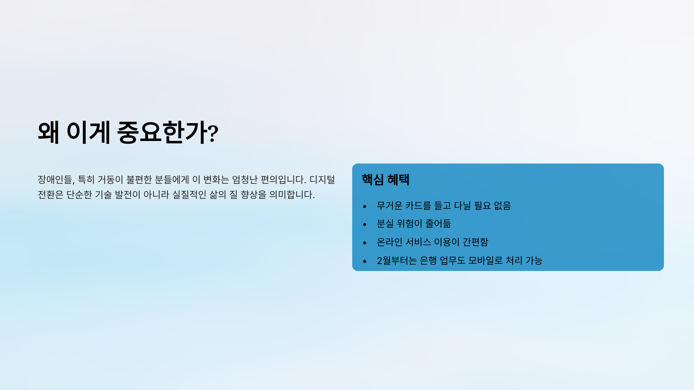 이제부터는 스마트폰 앱 하나에 장애인 등록증을 저장하고 다닐 수 있게 된 것입니다. 이것이 바로 **"모바일 장애인 등록증"**입니다.