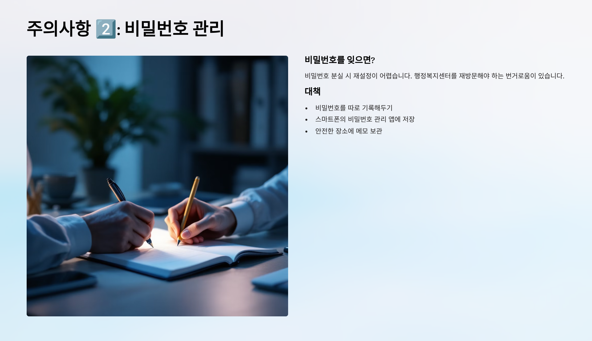 대책: 비밀번호를 따로 기록해두거나 스마트폰의 비밀번호 관리 앱에 저장해두세요.
