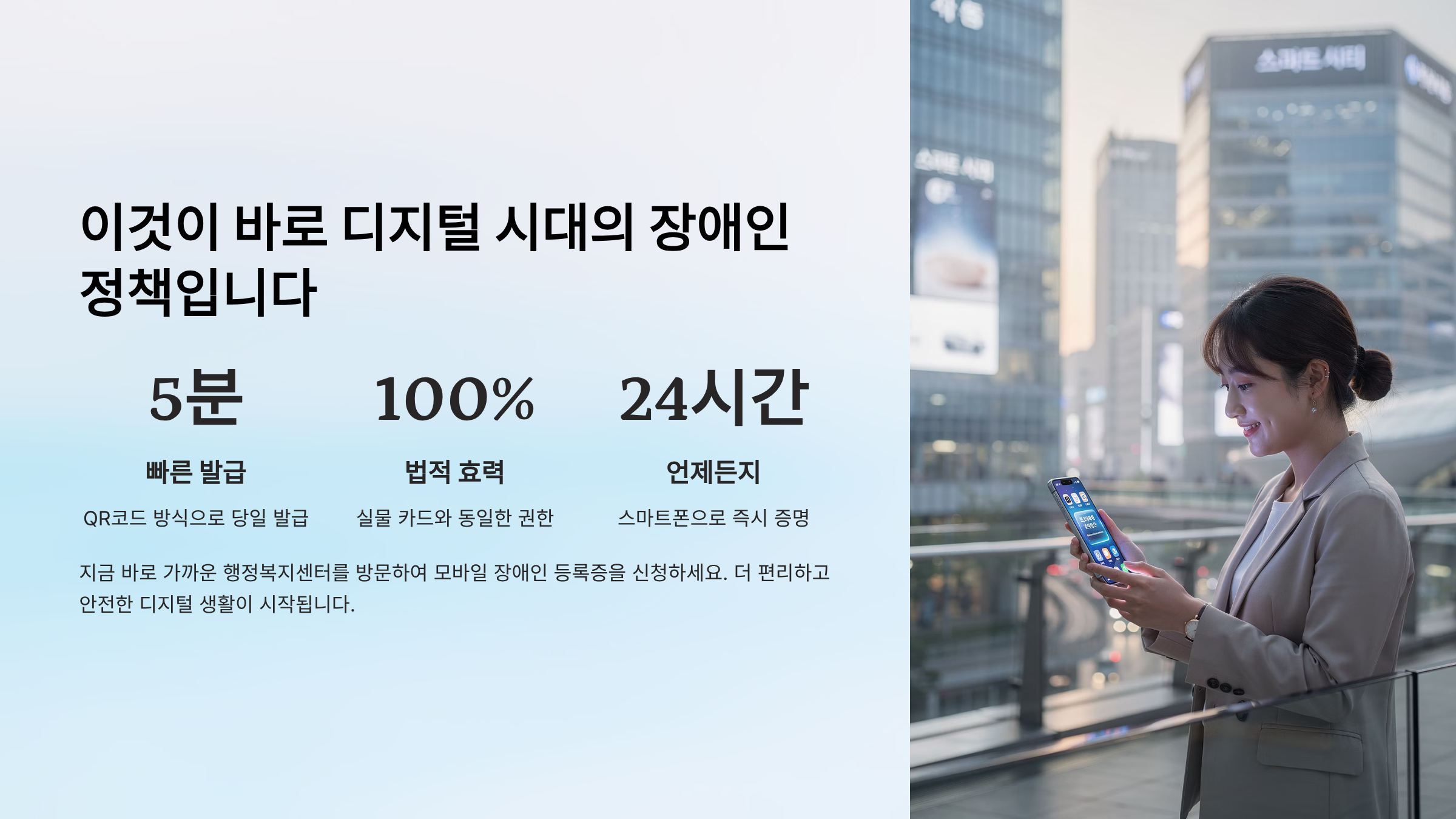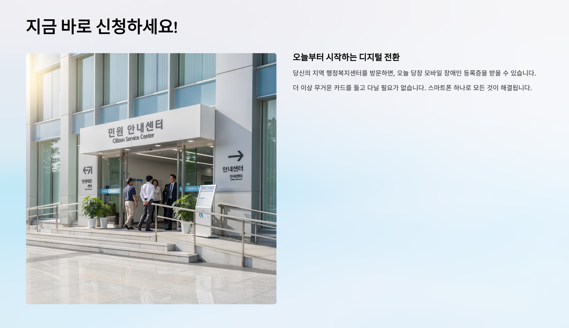 당신의 지역 행정복지센터를 방문하면, 오늘 당장 모바일 장애인 등록증을 받을 수 있습니다.