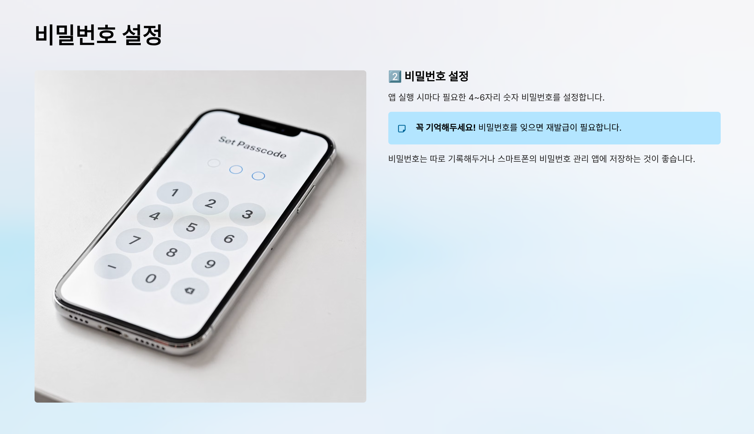 - 4~6자리 숫자 (앱 실행 시마다 필요)