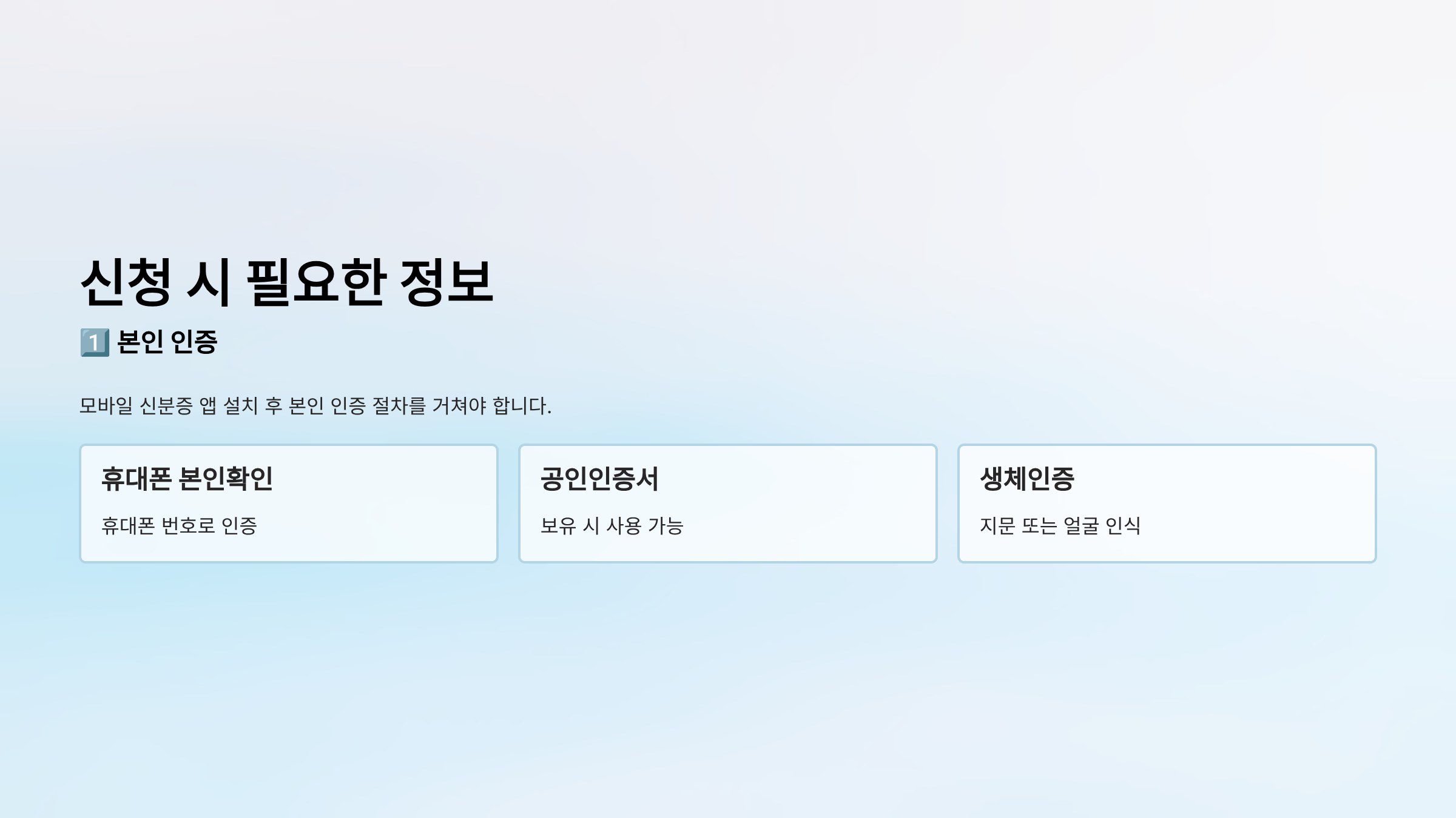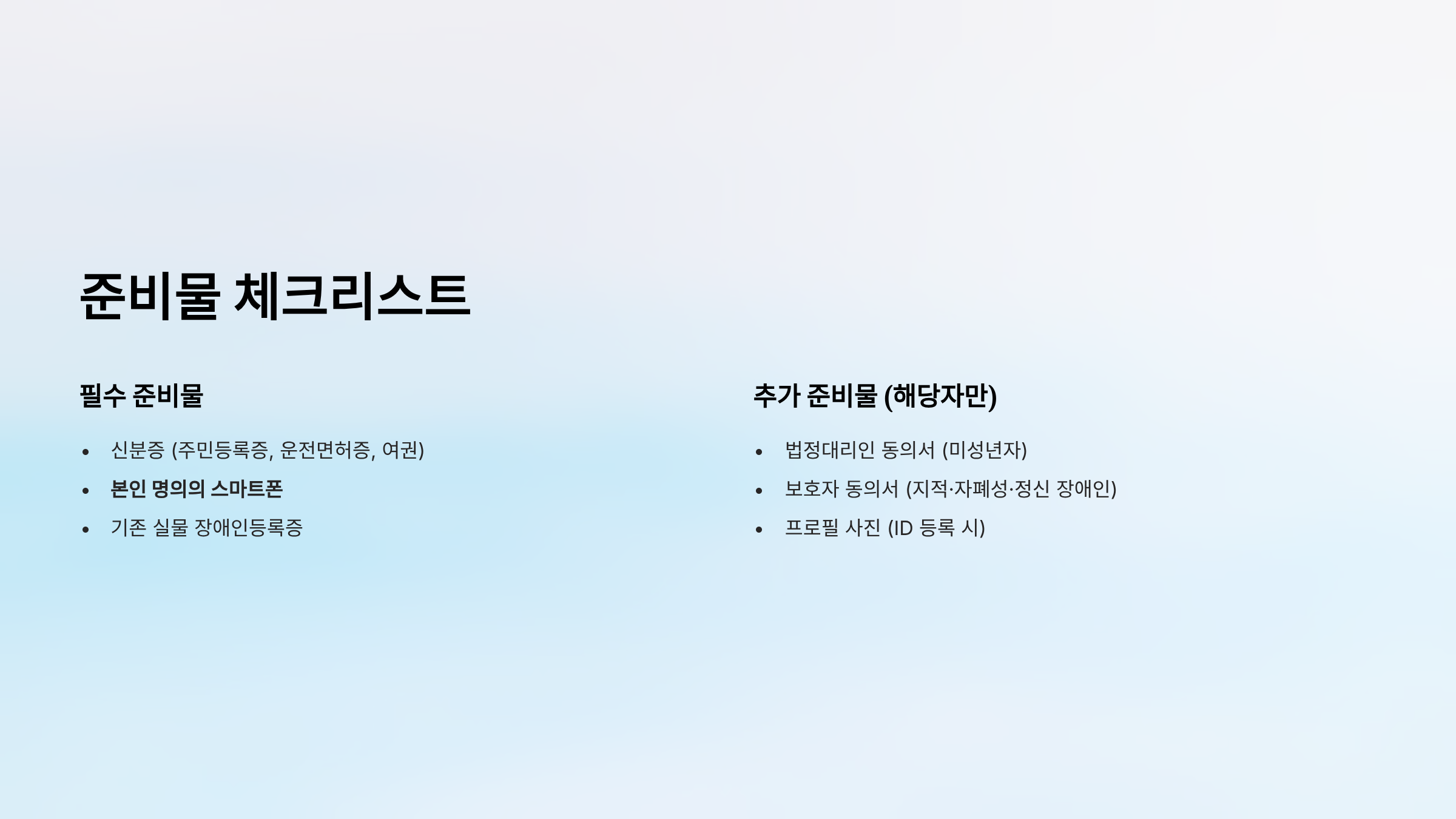 | 신분증 (주민등록증, 운전면허증, 여권) | 법정대리인 동의서 (미성년자, 지적·자폐성·정신 장애인) |