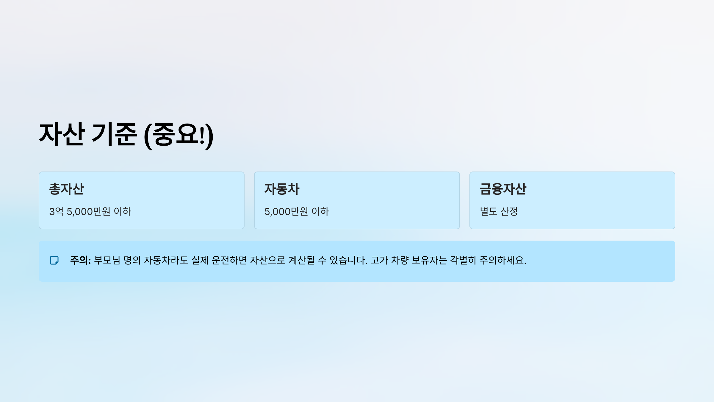 주의: 부모님 명의 자동차라도 실제 운전하면 자산으로 계산될 수 있습니다. 고가 차량 보유자는 각별히 주의하세요.
